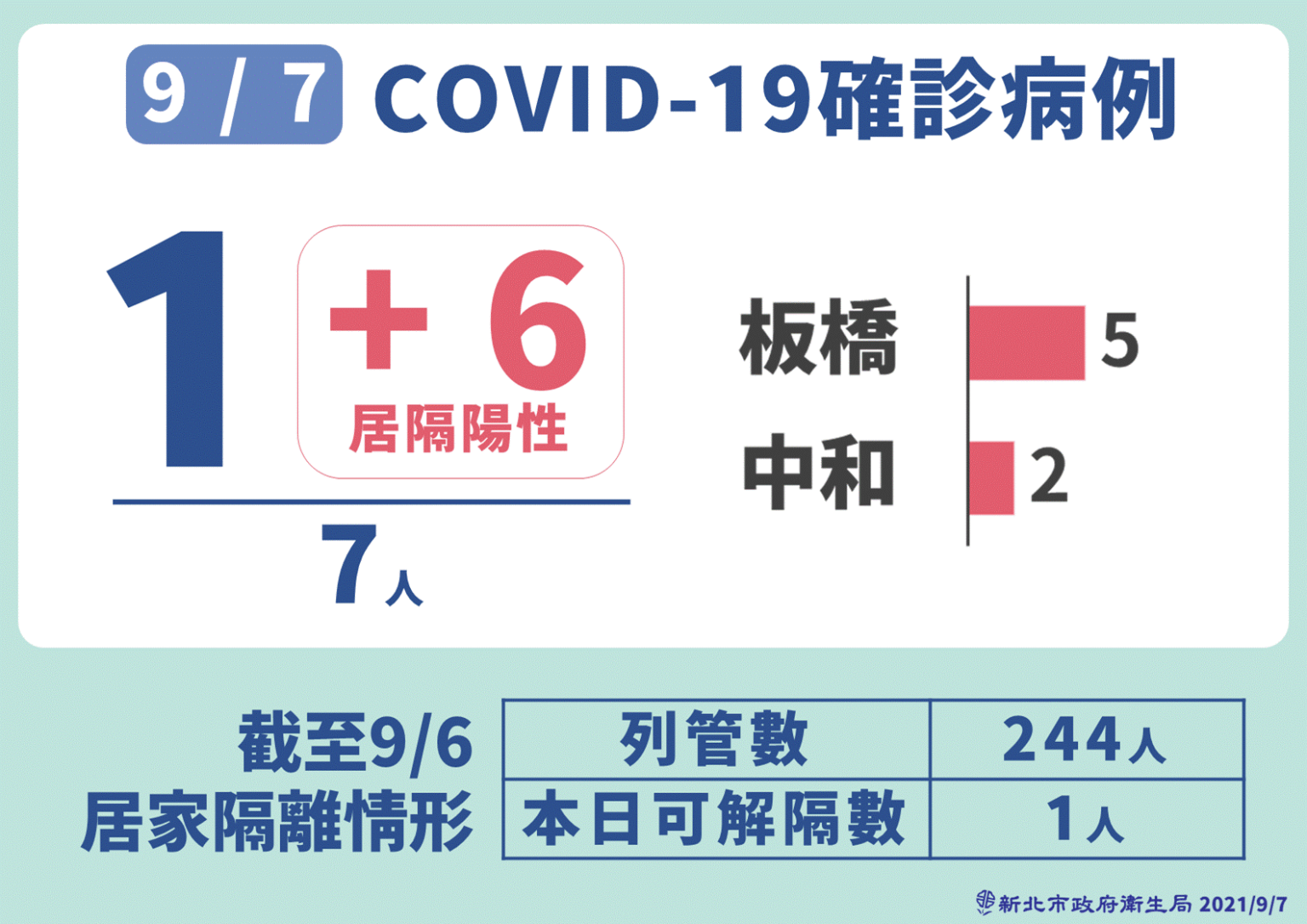 侯友宜今天主持新北疫情記者會,指出今天新增7例確診,當中5例是板橋幼兒園已居家隔離案例,另外2例則是發生在中和,初步研判兩者之間並無關聯。