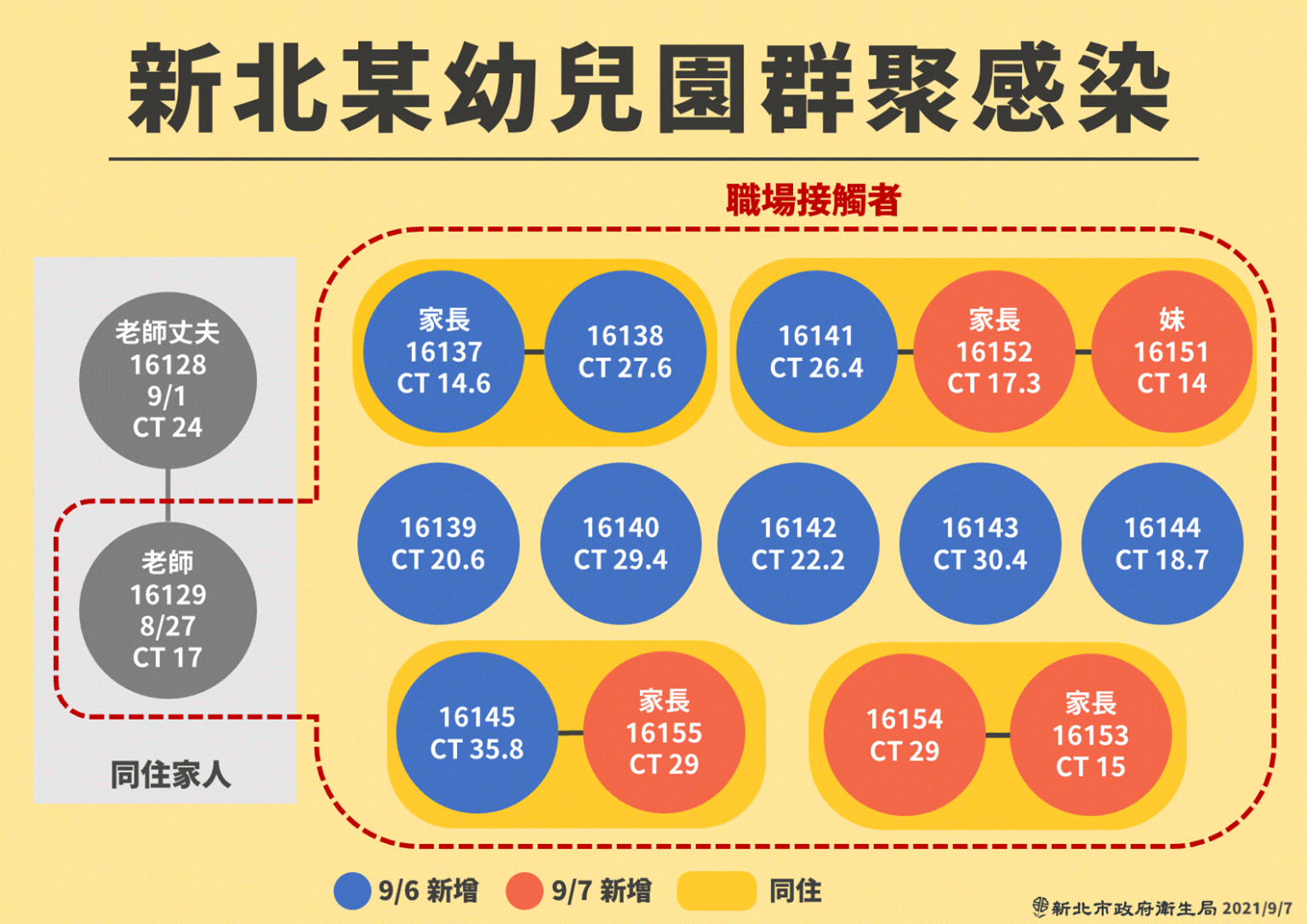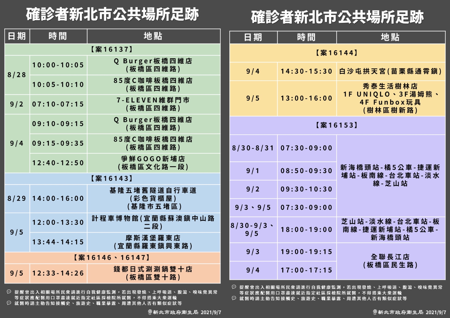 根據新北市初步疫調,案16137(幼兒園家長)足跡集中在板橋;案16143(幼兒)足跡達基隆、宜蘭,案16144(幼兒)曾前往苗栗、樹林;案12146、12147(中和祖孫)曾前往板橋;案12153曾前往台北車站、捷運芝山站。相關各縣市都已針對足跡地點進行消毒,苗栗緊急增設快篩站,宜蘭則宣布禁止戶外烤肉。