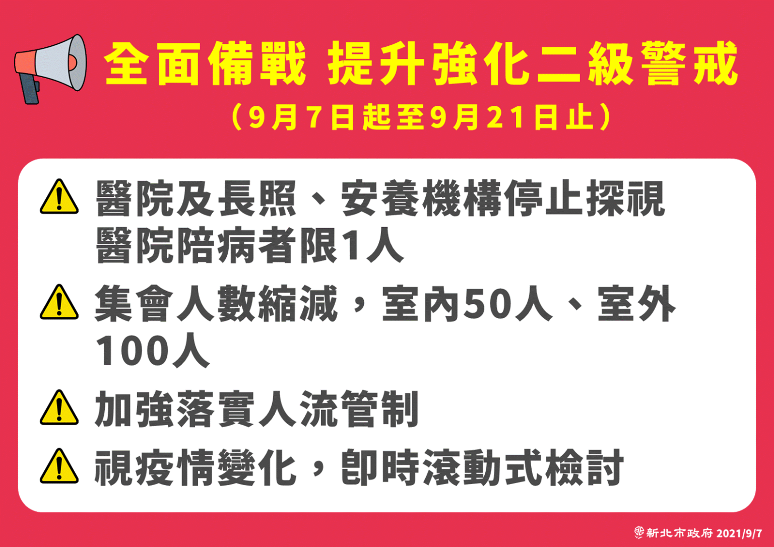 眼見這波疫情來勢洶洶,侯友宜今天宣布全市進入強化2級警戒,暫停醫院、長照機構、安養中心的探視與探病,集會人數縮減為室內50人、戶外100人以內,加強落實人流管制,期間從9月7日持續到9月21日,並會滾動式調整各項防疫措施。