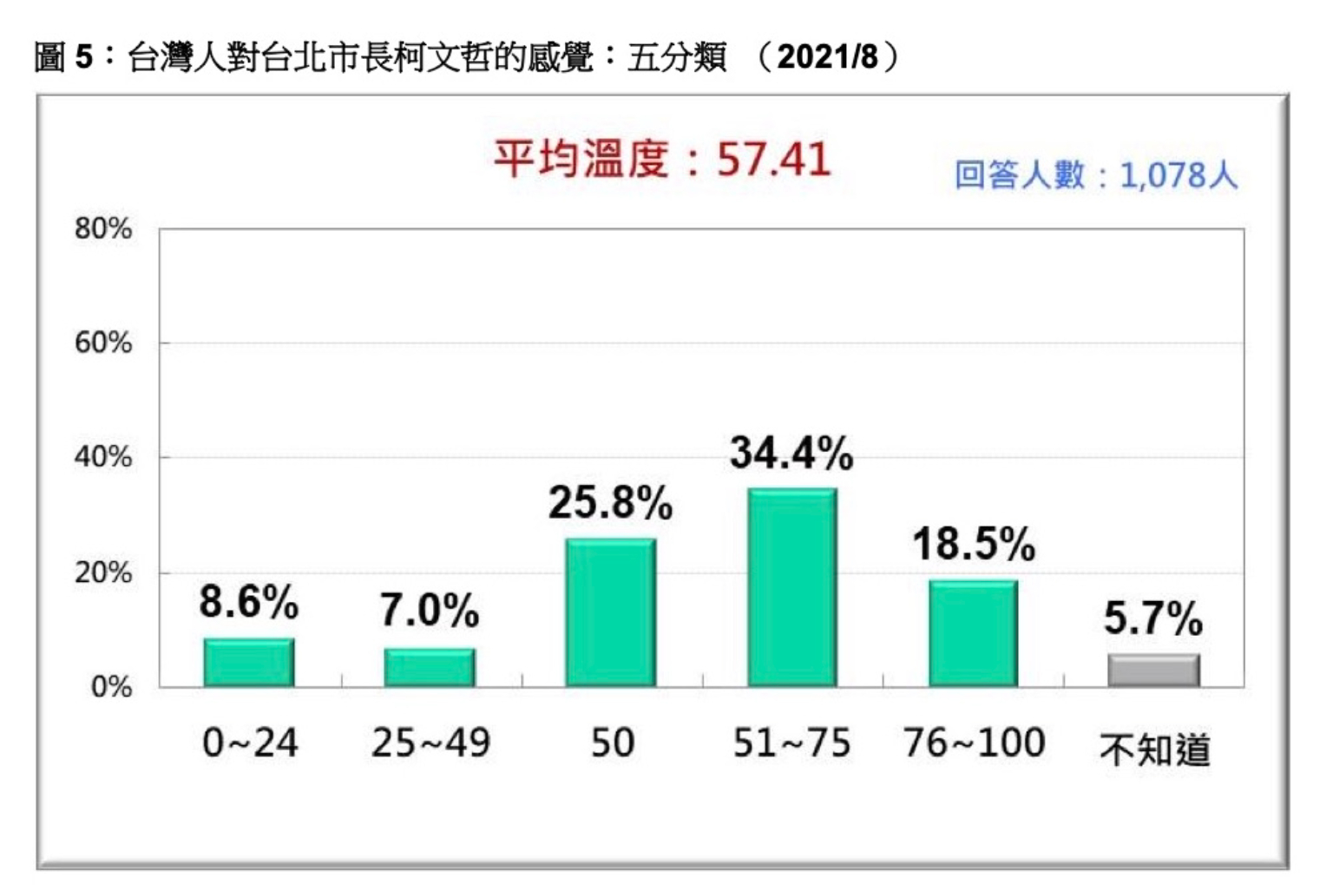 台灣人對柯文哲的感覺為何?最新研究發現顯示,在二十歲以上台灣人中,53%對柯文哲的感情溫度是51度以上,25.8%沒有感覺,15.6%對他的感覺是49度以下。