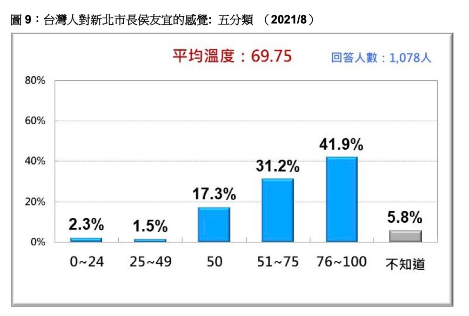 台灣人對侯友宜的感覺為何?最新研究發現顯示:73.1%對新北市長侯友宜的感情溫度是51度以上,17.3%沒有感覺,3.8%對他的感覺是49度以下。換句話說,最新民意顯示,在二十歲以上台灣人中,有七成三對侯友宜具有好感,一成三對他沒什麼感覺,約百分之四對他有反感。
