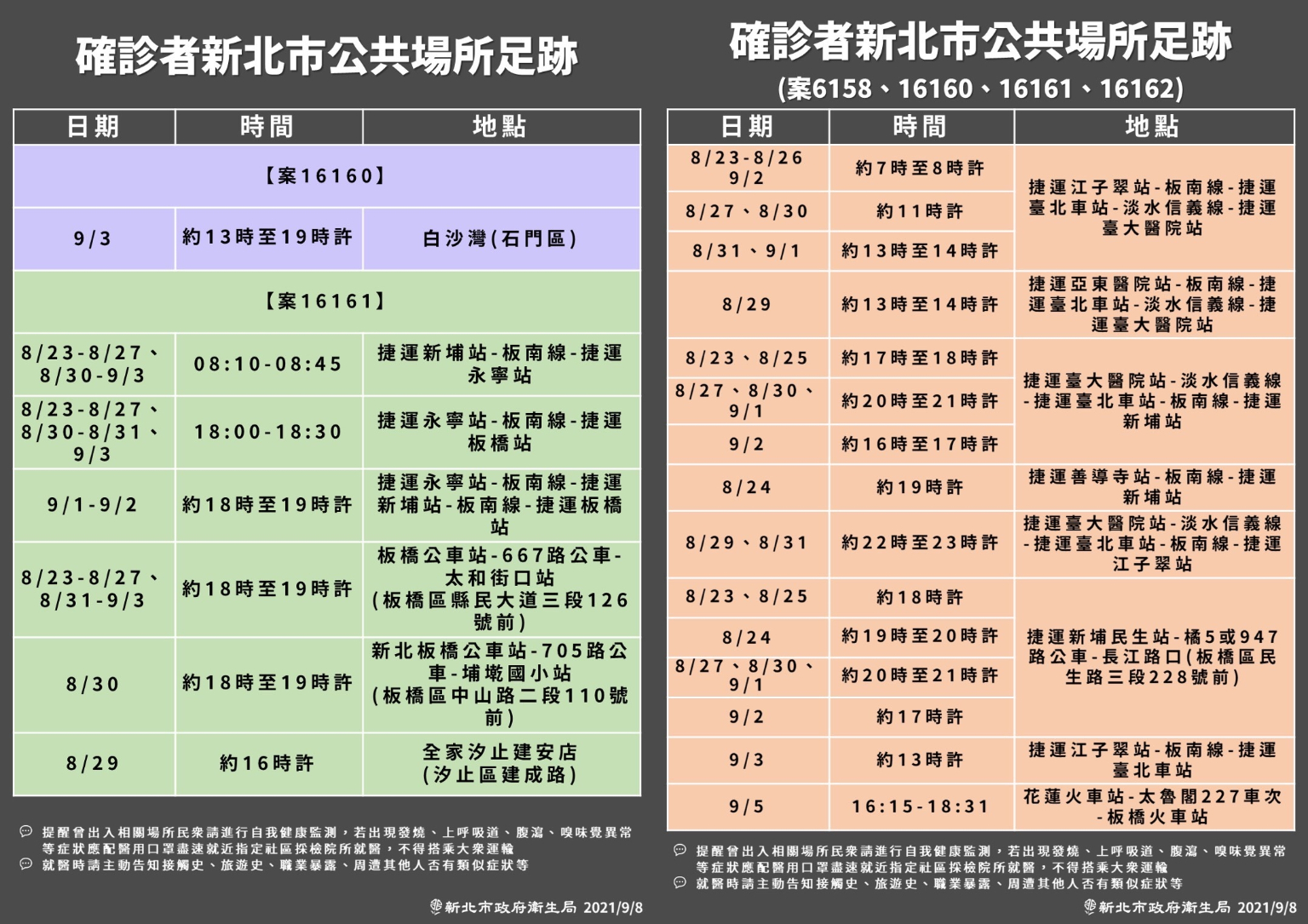 此外,案16161多在板橋活動,最遠曾至汐止。而案16158則在台大醫院工作,足跡都在板橋與台大醫院之間往返,但也曾在週末前往花蓮。而受到案16158在台大醫院工作的影響,台大醫院緊急啟動疫調及擴大篩檢1100人,經過PCR檢驗均為陰性,並沒有新增其他確診個案。