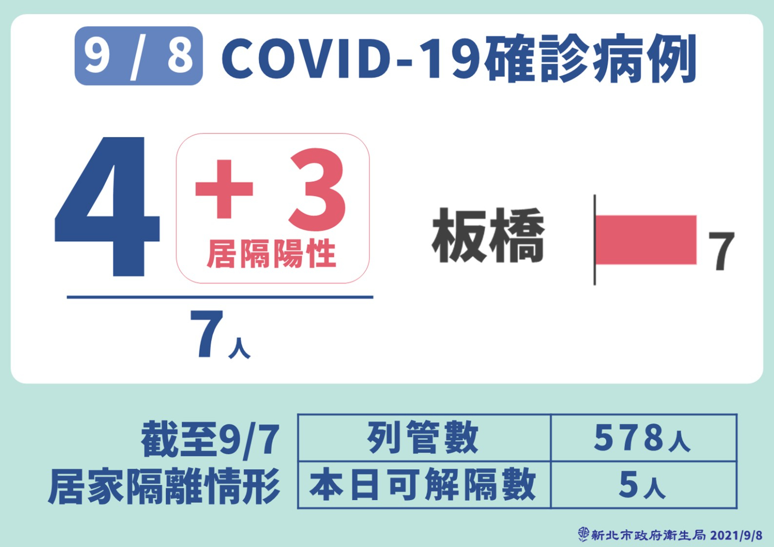 侯友宜接著指出,今天新北市新增確診7例,全部都位於板橋,當中3例是居家隔離採檢確認,但另外4例則不是居家隔離。他並指出,新增7例之中,有6例與幼兒園群聚有關;第7例則是自行赴醫院急診而採檢確診,是與幼兒園無關的感染源不明個案。