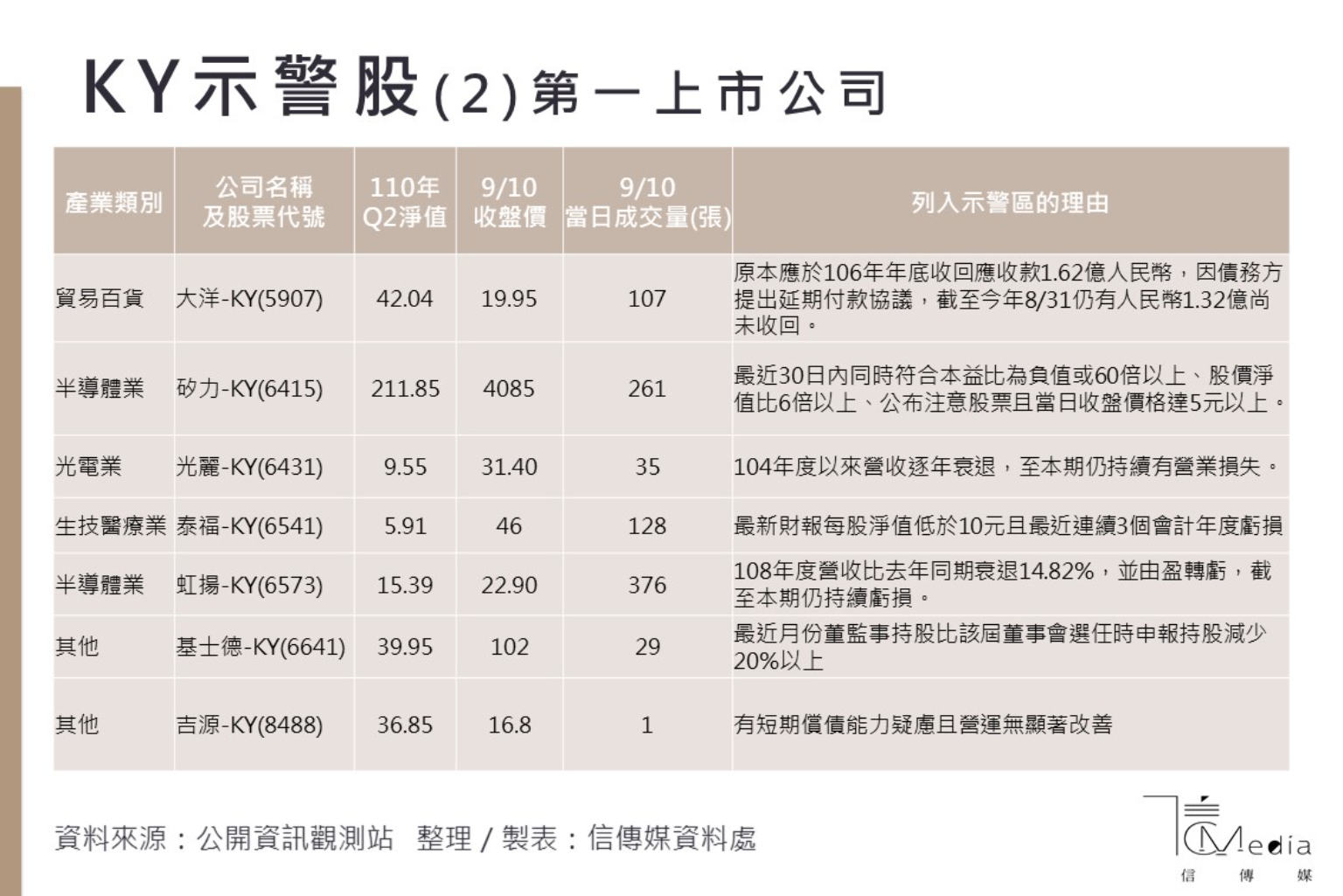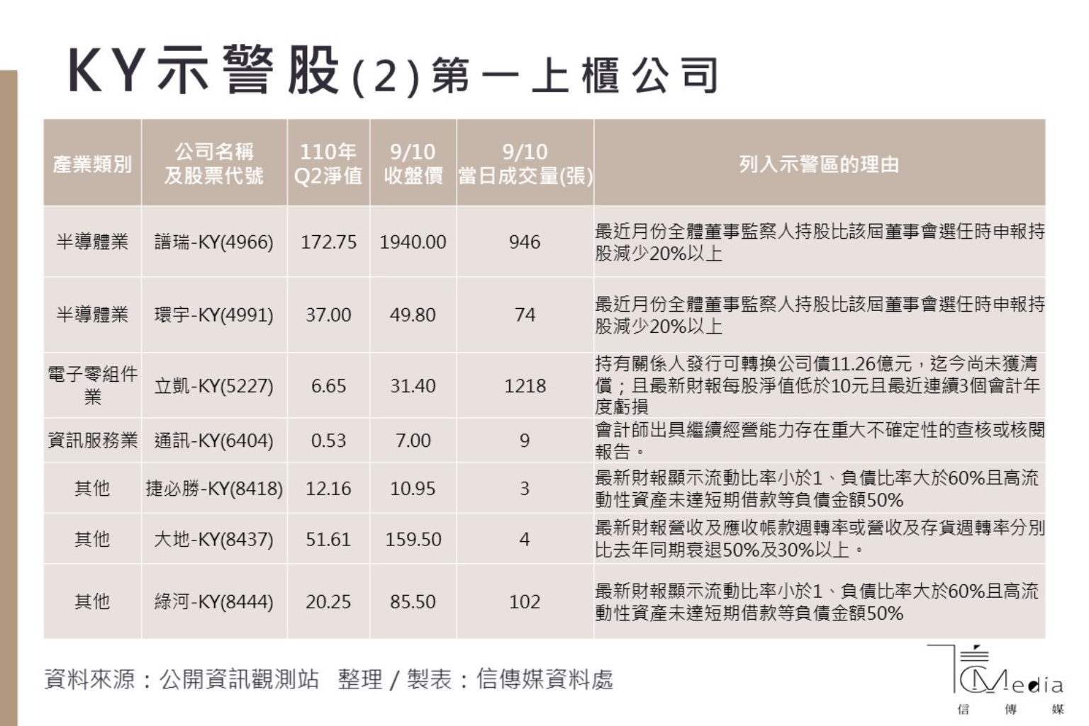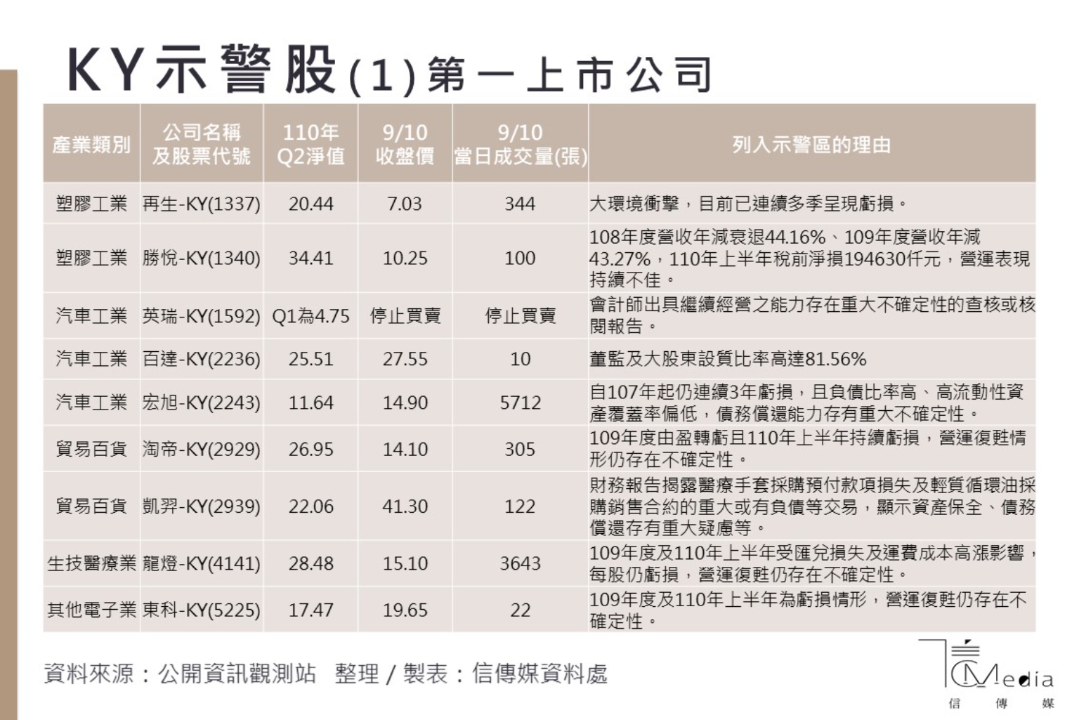 凱羿-KY則因財報揭露醫療手套採購預付款項損失及輕質循環油採購銷售合約的重大或有負債等交易案,顯示資產保全、債務償還存有重大疑慮,或對股東權益產生重大不利影響之虞,也同樣被列為示警股。