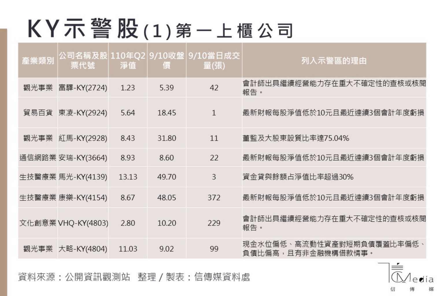 從這31家被示警的KY股來看,汽車水箱廠英瑞-KY,由於會計師出具繼續經營能力存在重大不確定性的查核報告,至今已被停止買賣,因此被示警;另外,中國童裝品牌淘帝-KY由於今年上半年每股虧損4.48元仍持續虧損,營運復甦情形存在不確定性,也被列入示警名單中。