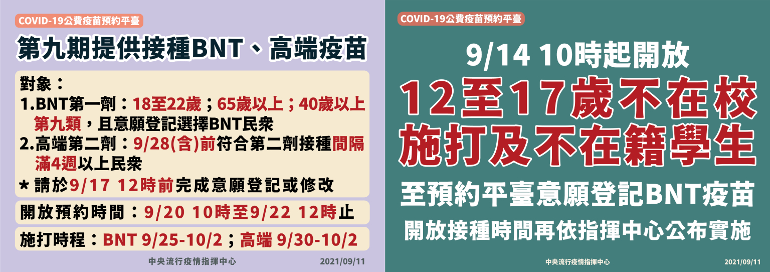 中央流行疫情指揮中心今(11)日表示,「COVID-19公費疫苗預約平臺」( https://1922.gov.tw/ )第九期將提供BNT疫苗及高端疫苗,相關說明如下: