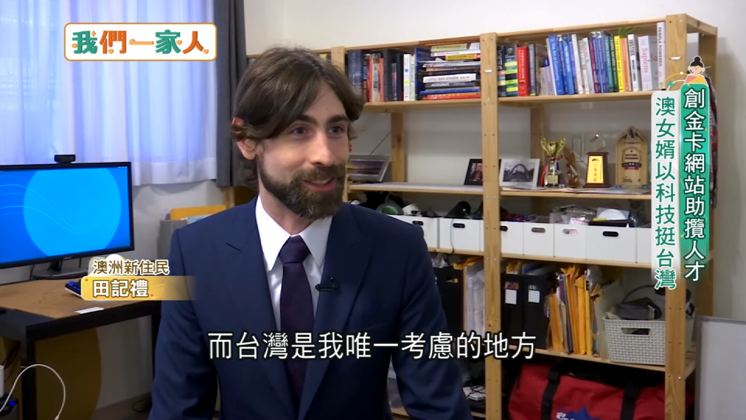 接下來這位澳洲新住民,他的中文名字叫田記禮,2018年取得就業金卡,2020年入籍臺灣,他跟太太都是高科技人才,專做雲端安全與5G領域,因為愛臺灣,於是主動設計了民間版的就業金卡網站,以更便捷的方式,幫助想要申請的外籍人士,更容易上手,現在政府也與他們合作,要讓更多人才湧入臺灣。