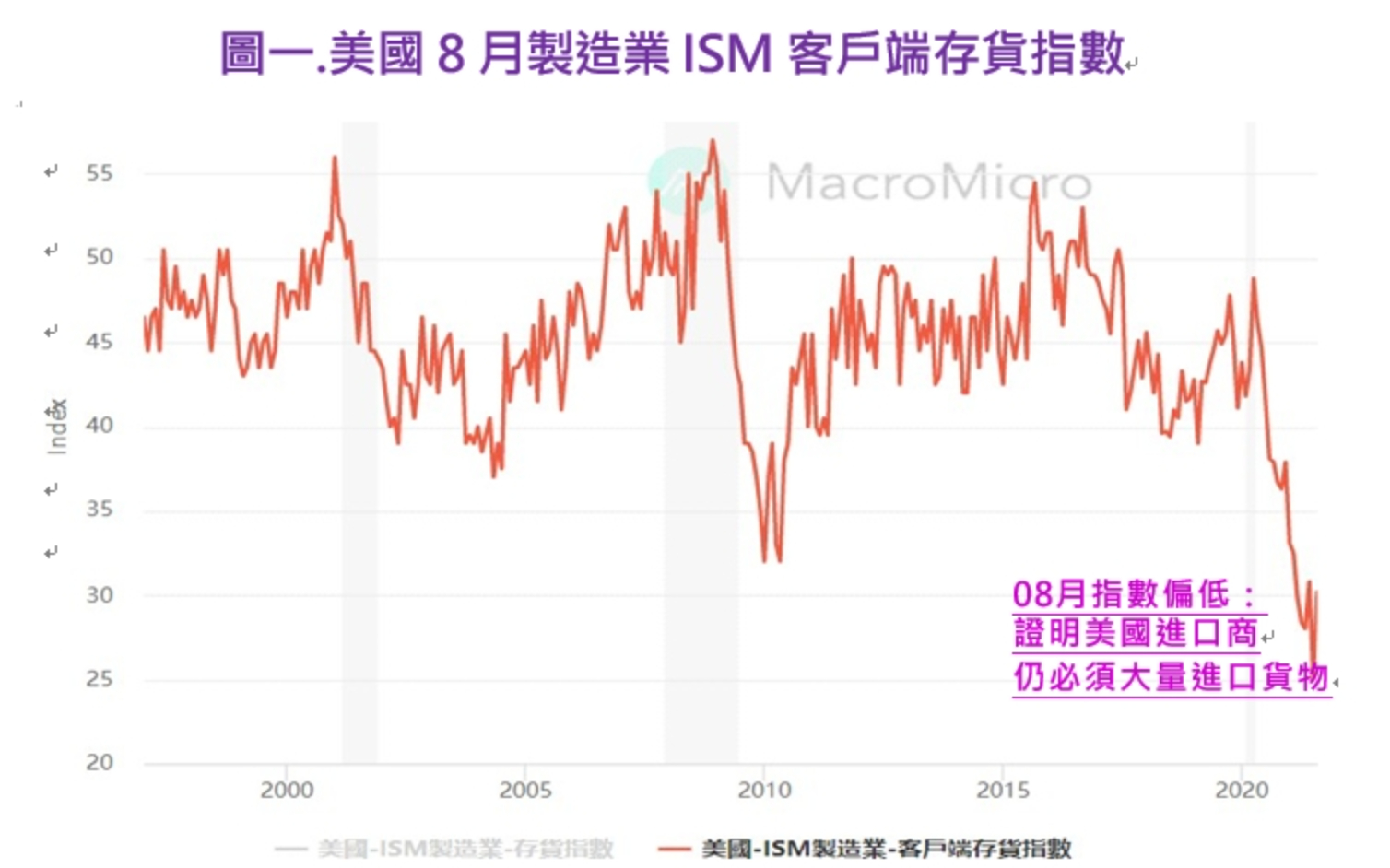 因肺炎疫情影響造成生產供應鏈中斷及缺貨嚴重,使得Just in Time庫存管理模式崩解,美國公布7月庫存比仍在20年新低,雖然8月稍微回升,見下圖一所示。