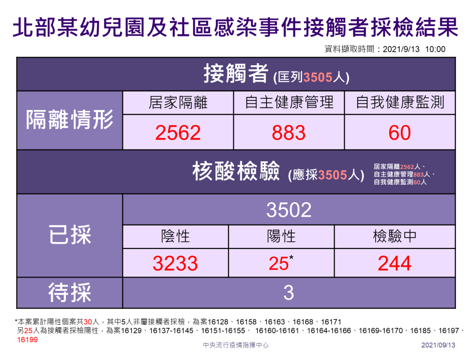案16203為60多歲女性,因家戶接觸者確診(案16179)而被匡列居家隔離,9月11號由衛生單位安排採檢,於今日確診,相關接觸者匡列中。衛生單位將持續進行疫情調查及防治,以釐清感染源。