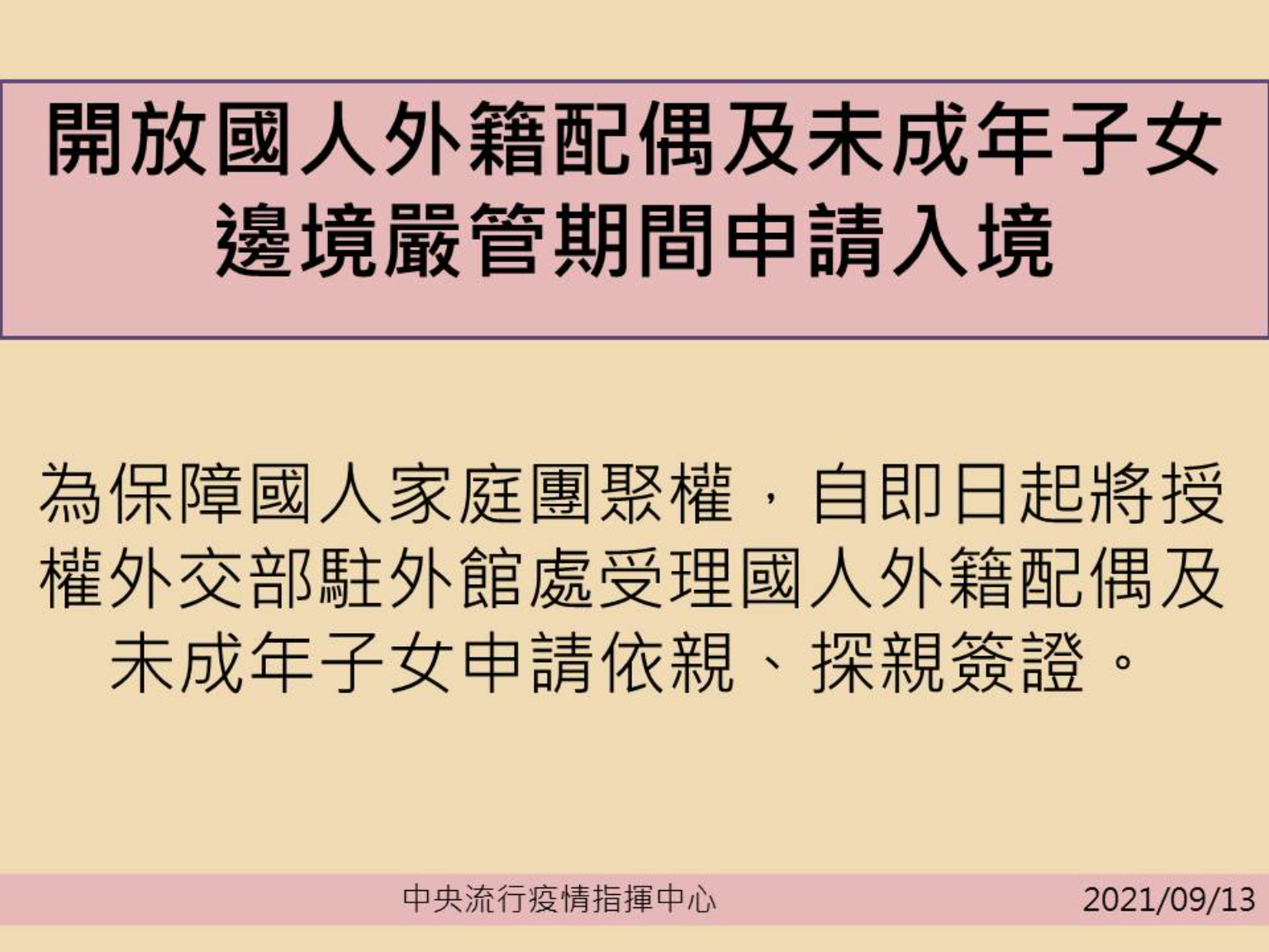 中央流行疫情指揮中心今(13)日表示,我國自本(2021)年5月19日起於全國疫情警戒第三級期間基於整體防疫考量,暫緩未持有我國有效居留證的非本國籍人士入境,外籍人士如果因奔喪、探視病危親屬及陪產等緊急重大事由急需來臺,必須經指揮中心專案許可後才能向駐外館處申請特別入境許可簽證。經考量國內疫情現況已較趨緩,而國人家庭團聚需求殷切,為保障國人家庭團聚權,自即日起開放已完成結婚程序之國人外籍配偶及其國人外籍未成年子女得於邊境嚴關期間申請入境。
