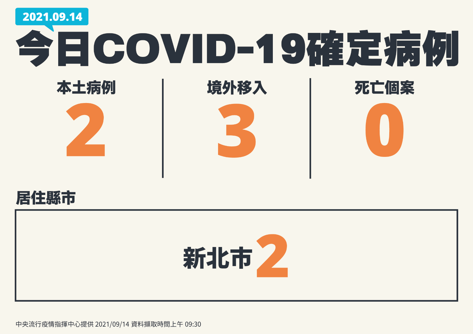 中央流行疫情指揮中心今(14)日公布國內新增5例COVID-19確定病例,分別為2例本土及3例境外移入;另確診個案中無新增死亡。