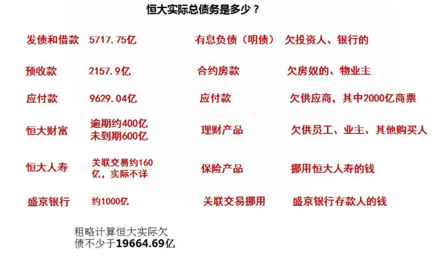 《深度財經》統計帳面和隱性債務發現,恆大截止到2021年上半年,包括借款、合約負債(預售房屋款項)、應付款項(對上游供應商欠款),恆大各項欠債超過2兆元人民幣,而這些債務還不包含戰略投資人的2647億,所謂戰略投資是指債務轉為股票,就是恆大欠股東的錢,戰略投資人這筆錢很難拿回來。