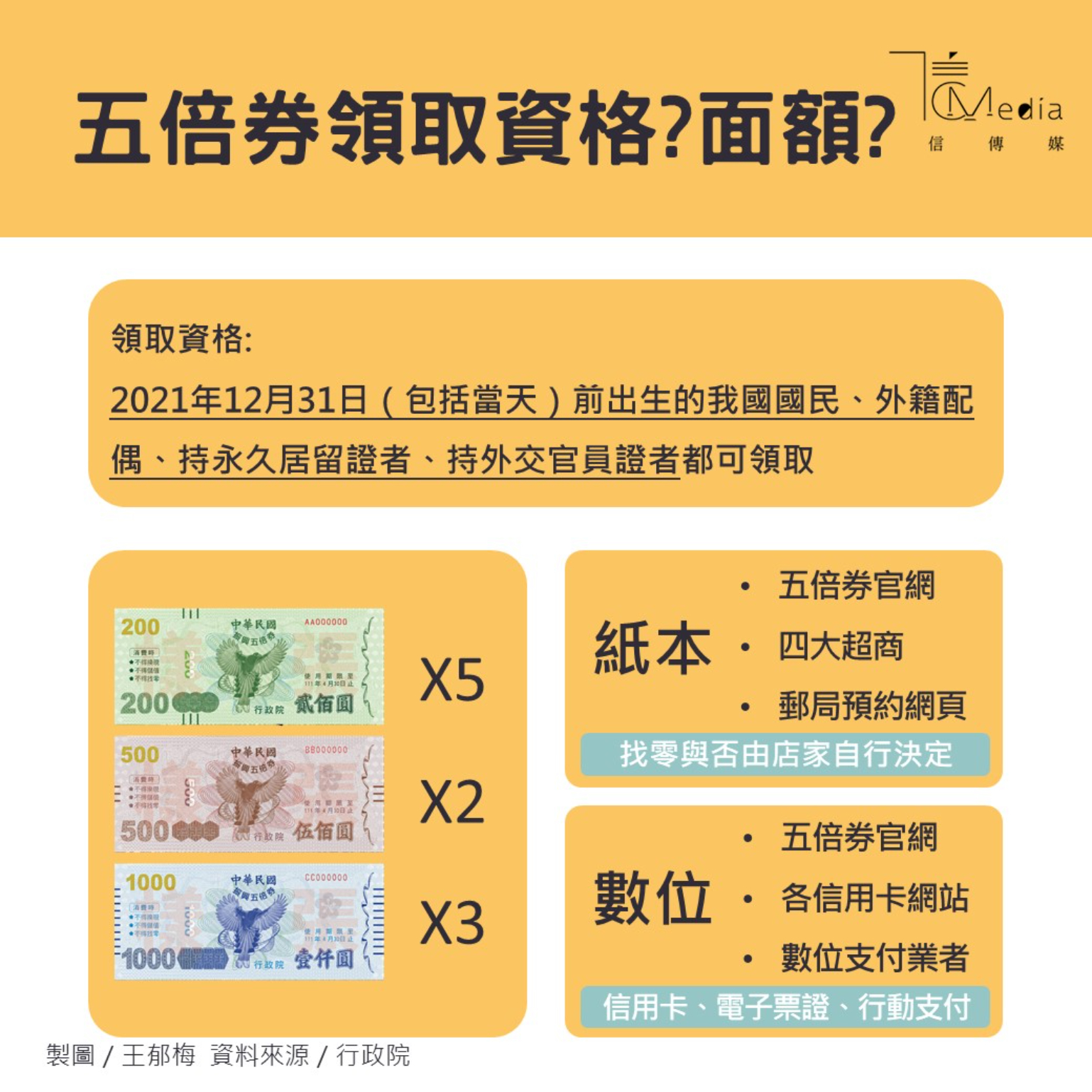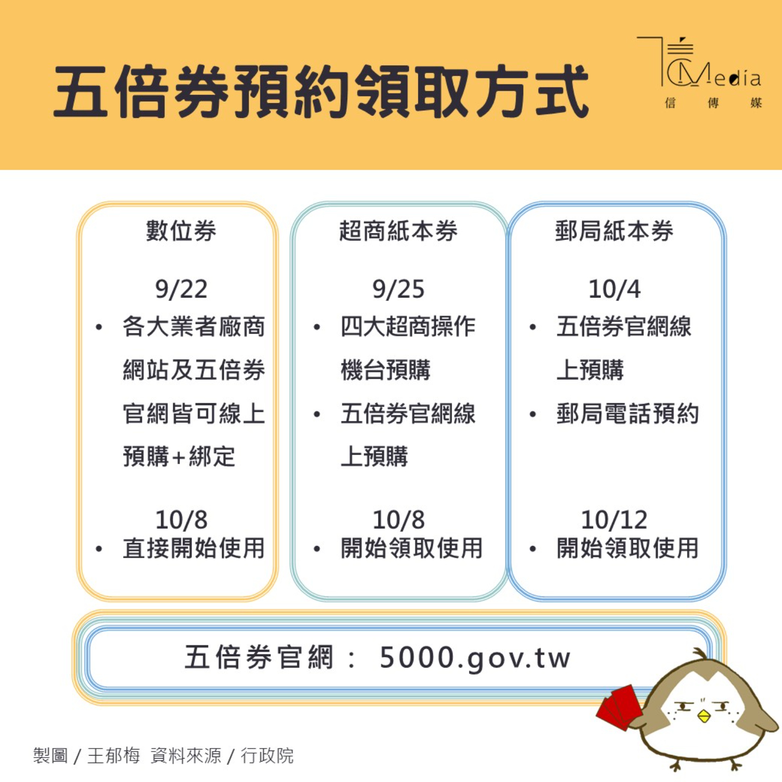 行政院推出的「振興五倍券」將於10月8日正式開始領取使用,振興五倍券官網「5000.gov.tw」也已經於前兩日正式上線,此次與三倍券差不多,一樣分成數位券和紙本券,數位五倍券將於9月22日起綁定、紙本券從9月25日起四大超商機台可預約,行政院政務委員唐鳳為此規畫「一站式」的登記平台,同時還可以一次完成8種部會加碼券抽籤登記。