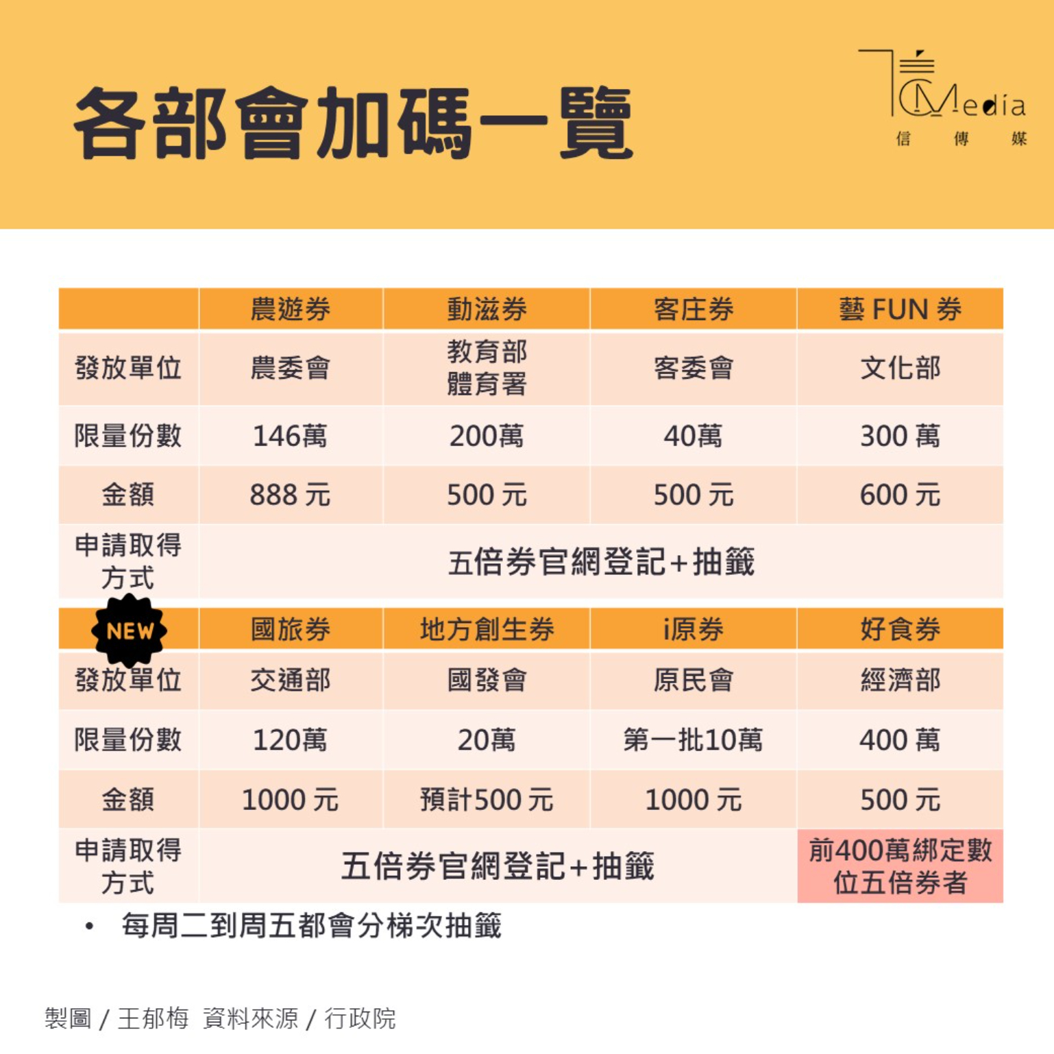 各部會也加碼推出8類加碼券,除「好食券」好食券免抽籤,前400萬名綁定數位五倍券者,即可領取外,其餘包括藝Fun券、農遊券、國旅券、動滋券、客庄券、i原券以及地方創生券等,都有名額限制,須登記抽籤;將於10月11日至11月5日共4周進行抽籤。