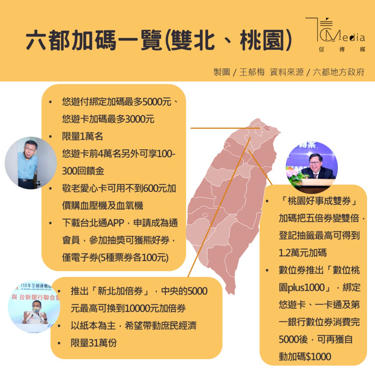桃園市推出「桃園好事成雙券」加碼把振興五倍券變雙倍,經過登記抽籤最高可得到1萬2000元的加碼。另外在數位券的部分桃園市府也推出「數位桃園plus1000」,讓綁定悠遊卡、一卡通及第一銀行數位券的民眾消費完5000元後,可以再獲得自動加碼的1000元,讓五倍券成為「六倍券」。