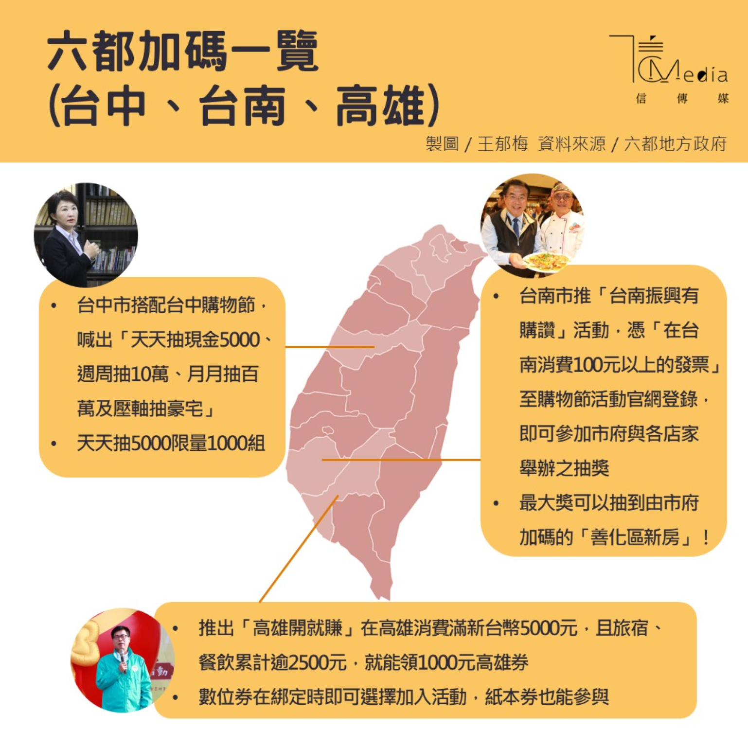台中市加值計畫,不同其它縣市「以券換券」,配合國慶日即將登場的第三屆台中購物節,祭出現金大放送,天天抽5000元、週週抽10萬元、月月抽百萬現金,以及最終壓軸千萬好宅,加碼獎項總額逾3億元,吸引民眾到台中消費。