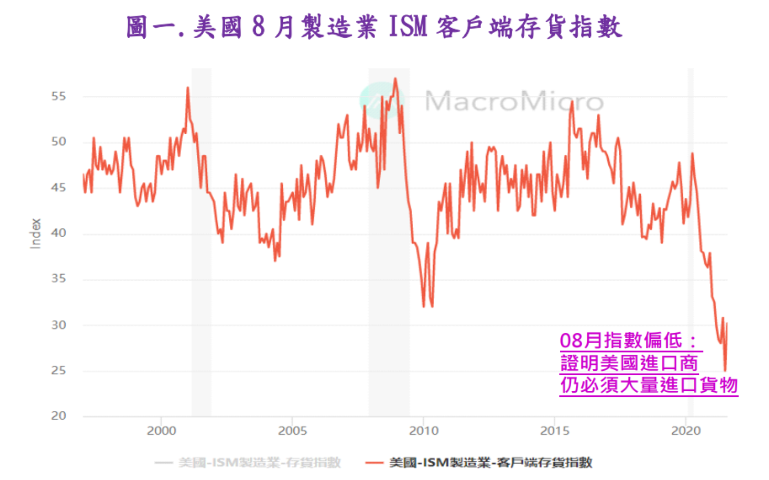 雖然短線全球股市會受到美國FOMC會議,及港股及陸股會受中國恆大案的影響,但聚焦中長線推升全球經濟成長的動力才是最重要,這也是全球股市長線發展的驅動力;因美國基礎建設老舊,美國將投入大筆資金做建設,加上中國也大量投入基礎建設,並打擊遊戲股、比特幣挖礦及娛樂圈來引導市場資金往實體經濟投資,上述將是促進全球經濟發展最重要的推動力。且因美國庫存仍在30年新低,見下圖一所示,新冠肺炎疫情造成生產斷鏈使得廠商嚴重缺貨及損失, 不留庫存的Just in Time庫存管理模式崩解,尤其汽車產業缺貨嚴重,逼迫生產商必須開始建立安全庫存,避免生產及銷售斷鏈造成巨大損失。
