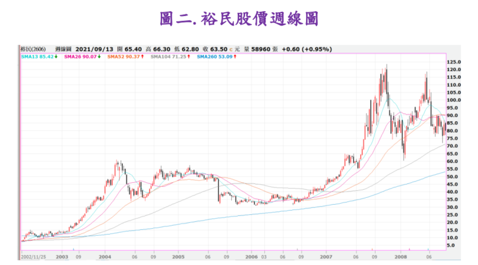 因Just in Time庫存管理模式崩解,預期全球任何廠商將會增加安全庫存量, 未來全球生產商及銷售商增補庫存將是推升全球景氣的重要推手;中美基建大增有利全球經濟復甦及股市正面發展,未來幾年對原物料需求將會大幅增加及通膨也會上升,預期原物料漲價及抗通膨概念股將浮上檯面,可能未來傳產漲價股表現會優於電子股。例如前一波中國大基建,造就鐵礦砂、散裝航運、鋼鐵、塑化、石油等原物料大行情,2003~2008年就大漲上述產業及個股,其中裕民股價從2003年10元大漲到124元(不含除權息),見下圖二、裕民股價週線圖所示。
