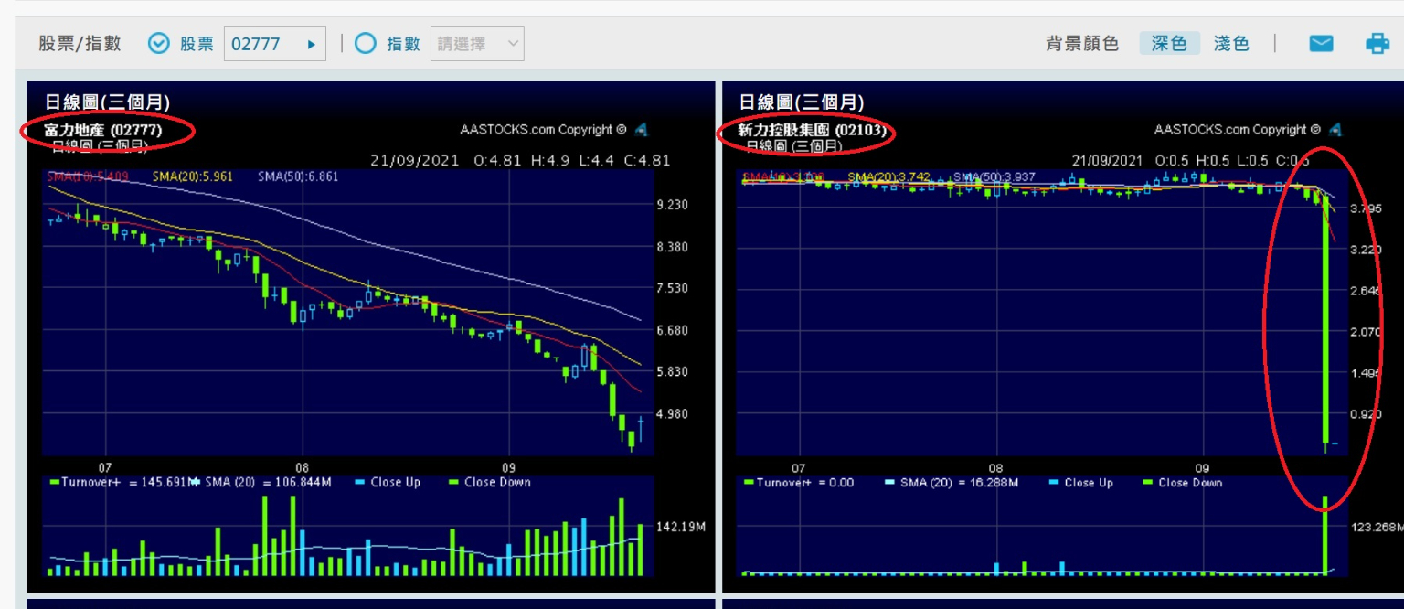 比較誇張的是新力控股,它在9月20日當天股價一直在3.9到4.1港元之間盤整,竟然在下午3點多從3.85港元直接重跌到0.5港元,大跌87%,半小時內市值蒸發約120億港元(約428億台幣)。最令投資人不安的是,這類在港股掛牌的中國地產股,負面消息都還沒曝光,就先重跌了,讓許多投資人錯手不及。