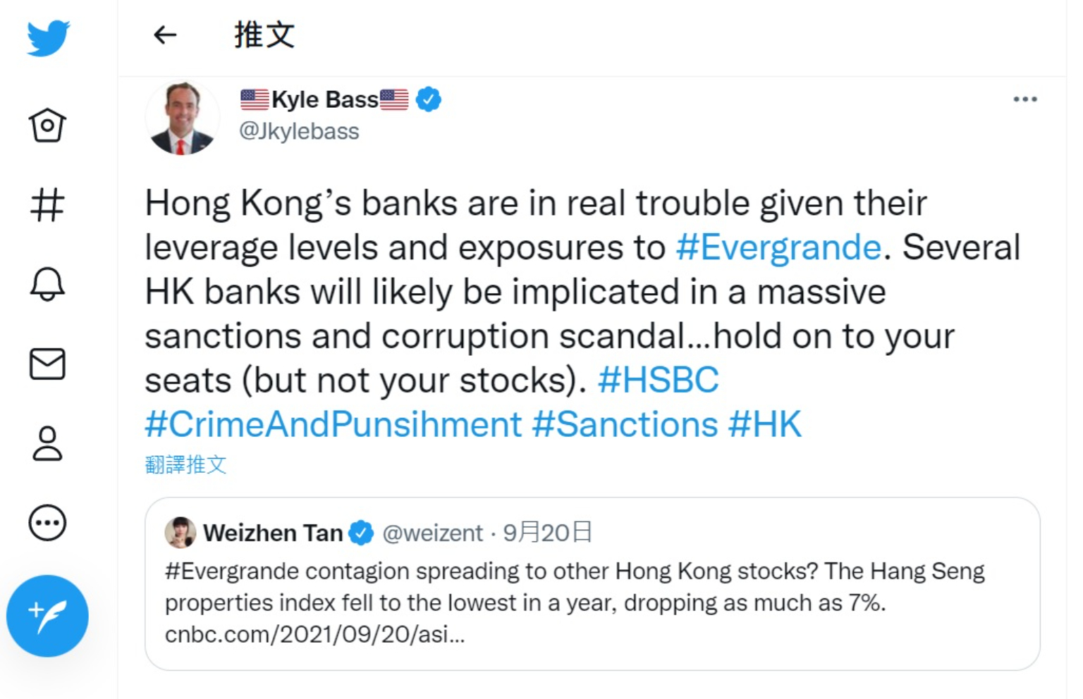 對於這波中國地產股崩跌,凱爾巴斯在推特上用「banking crisis」是一語雙關,除了銀行因為放款給地產公司而慘遭倒帳的危機之外,從他標記匯豐銀行就暗示著,這些銀行還可能涉嫌非法貸款、超貸給這些地產公司,恐面臨司法上的調查和整肅,是另一種的「banking crisis」。