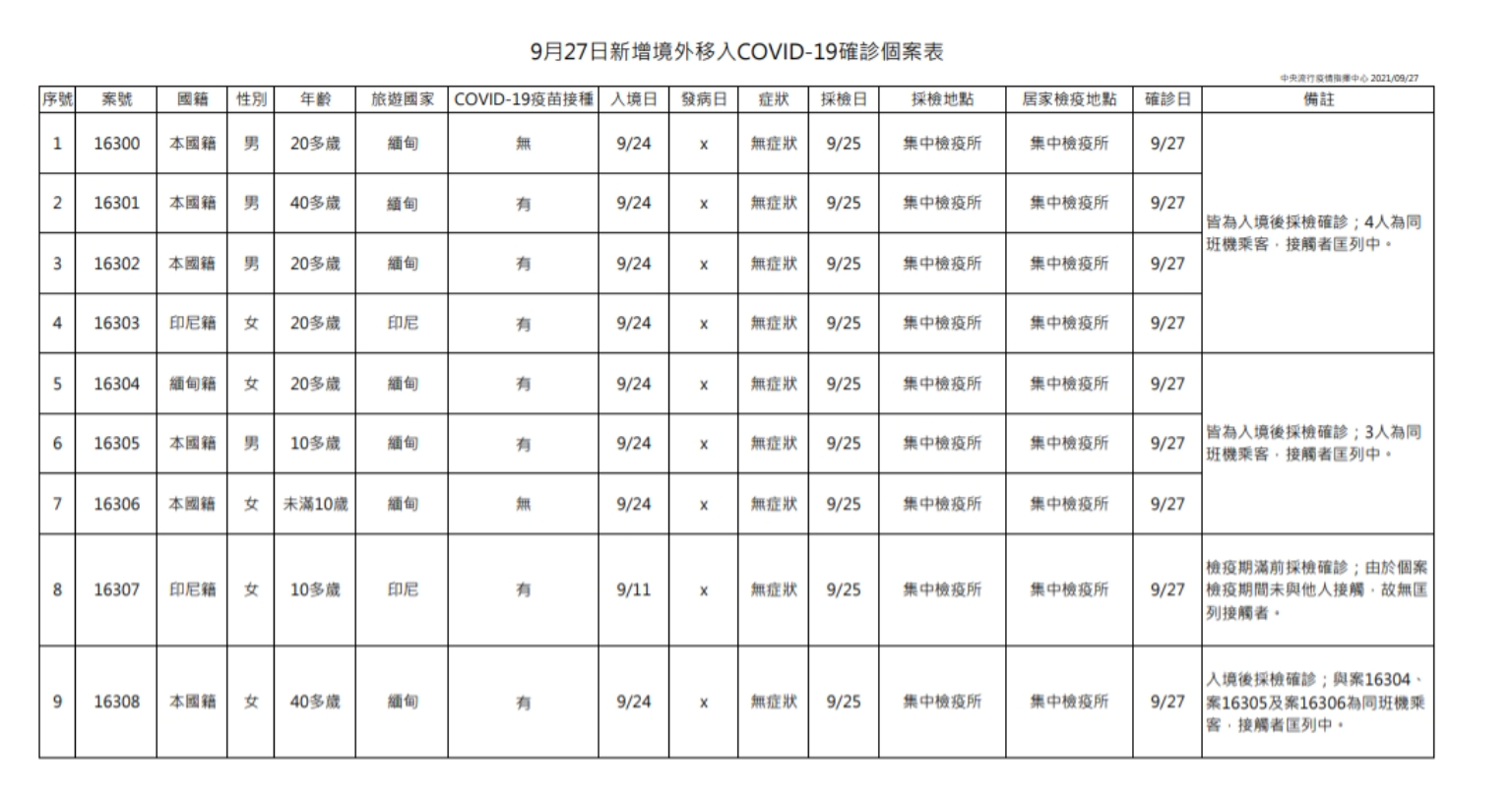 指揮中心指揮官陳時中表示,今日新增9例境外移入個案,為4例男性、5例女性,年齡介於未滿10歲至40多歲,分別自緬甸(7例,案16300-16302、案16304-16306、案16308)及印尼(2例,案16303、案16307)入境,入境日介於9月11日至9月24日,皆持有搭機前3日內檢驗陰性報告;詳如新聞稿附件。