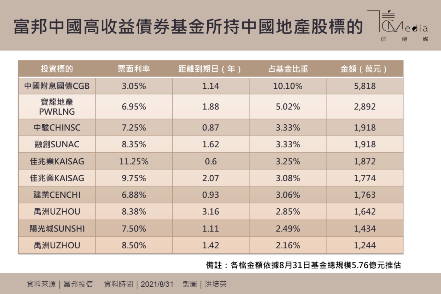 根據郭國文辦公室提供資料,例如富邦中國高收益債券基金所持有的中國地產股中,就包含恆大(8/31日前已出清)、佳兆業、融創、中國建業、碧桂園(8/31日前已出清)等高危險名單,有些公司的債券還持有兩種不同到期日的,而中國地產股占該基金整體比重高達6成。