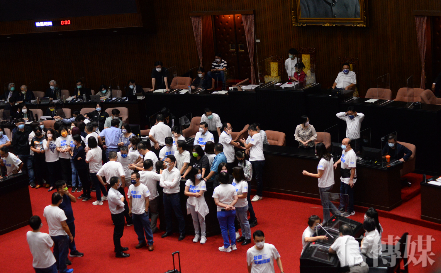 兩黨團人士在議場前僵持,直到7時議場開門,雙方人馬一擁而入衝入議場,搶攻發言台。民進黨在立委蔡易餘、王美惠與賴瑞隆強勢壓陣下,成功搶下發言台C位,國民黨立委則改將發言台包圍,雙方第二度拉扯,並僵持到9時開會。