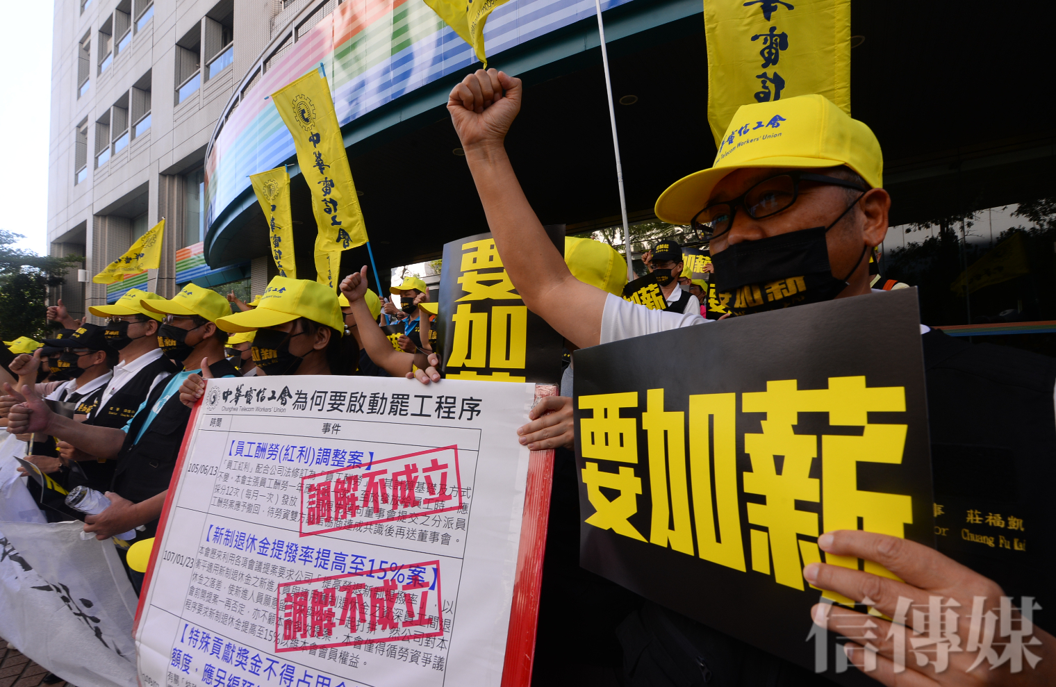 工會今日動員約70名員工,包圍中華電信總公司大樓,進行宣告罷工後首場抗爭行動。
