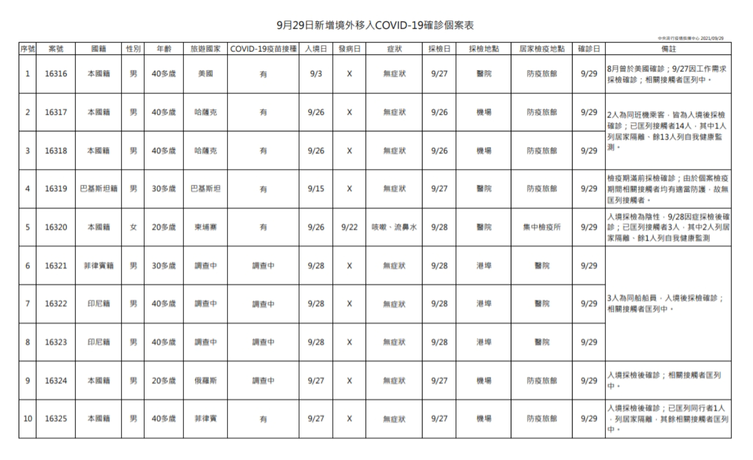 陳時中指出,今日新增10例境外移入個案,為9例男性、1例女性,年齡介於20多歲至40多歲,入境日介於9月3日至9月28日,分別自美國(案16316)、哈薩克(2例,案16317、案16318)、巴基斯坦(案16319)、柬埔寨(16320)、俄羅斯(案16324)及菲律賓(案16325)入境,餘3例 (案16321、案16322、案16323)的旅遊國家調查中;詳如新聞稿附件。