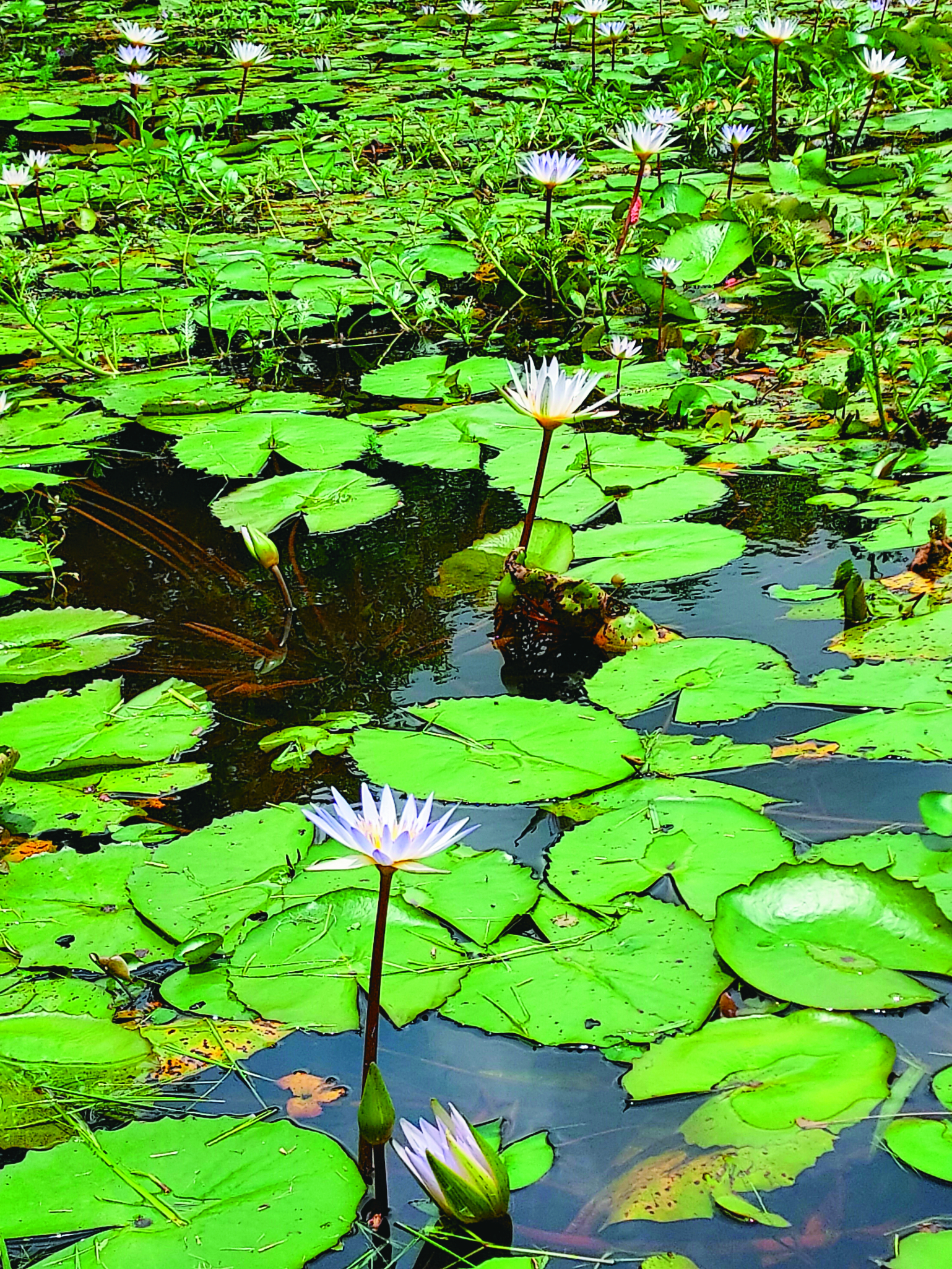 正因為想嘗試恢復的是整個埤塘生態,吳聲昱說自己有5年的時間幾乎是瘋狂地尋找各種水生植物種源。他帶著一本記載水生植物的書籍,按圖索驥地走訪各地,甚至曾在一天之內從桃園開車到花蓮富里,再南下至屏東鵝鑾鼻,凌晨12點才回到家,單日環島就為了尋找更多種類的水生植物。