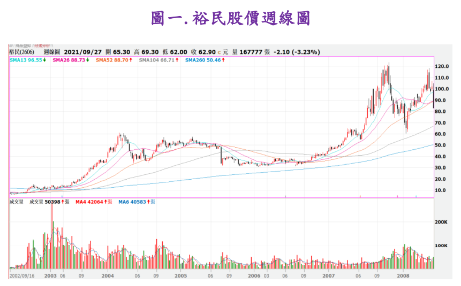 例如2000年初,中國實施大基建,2003~2008年期間造就散裝航運、鋼鐵、塑化、水泥等等原物料及船隻運輸需求大增的大多頭行情,其中裕民業績及獲利大好數年之久,股價也從10元不到,大漲到最高124元,走5~6年的長多大行情,這還不包含那幾年的配息及配股,見下圖一裕民股價週線圖所示。
