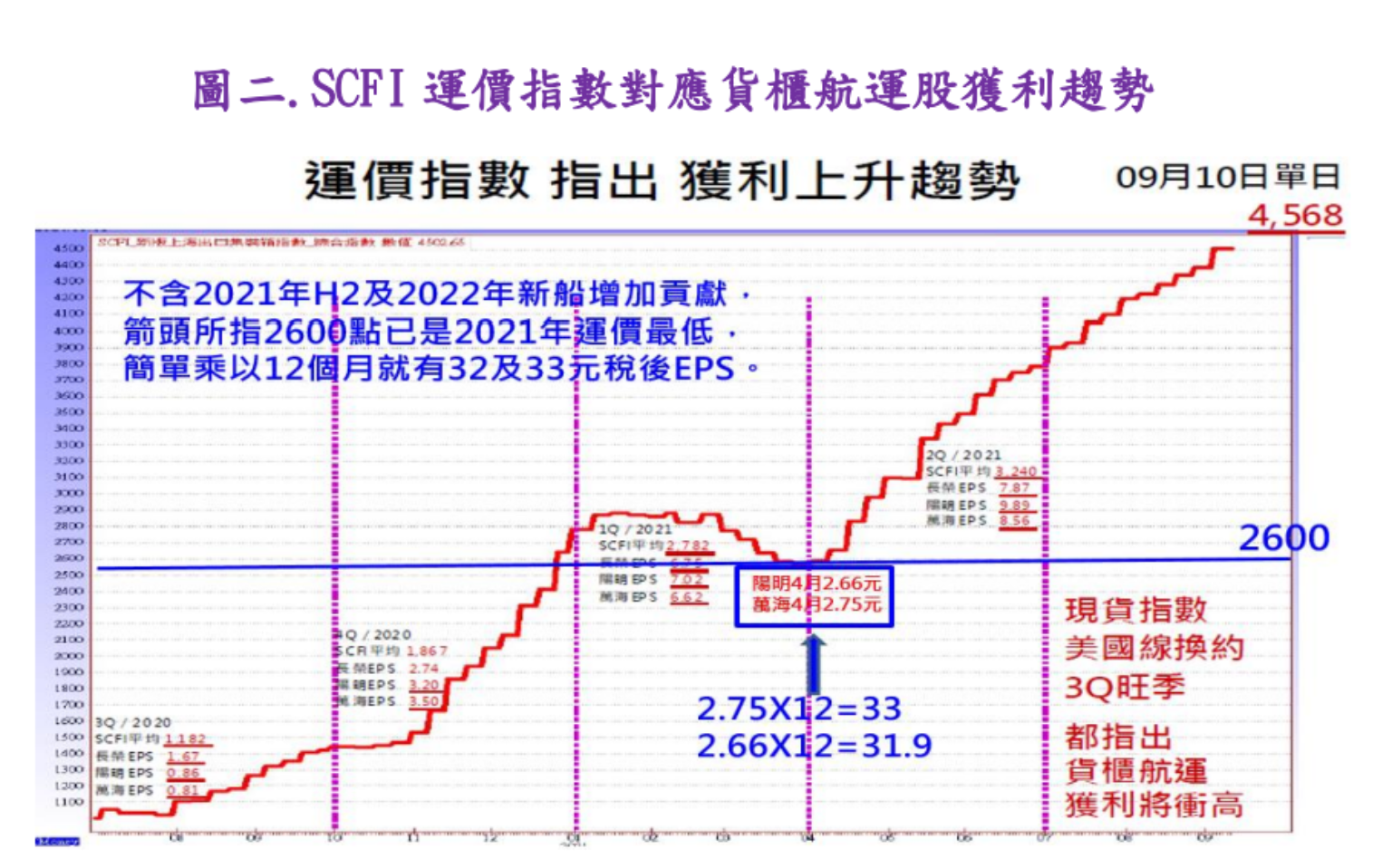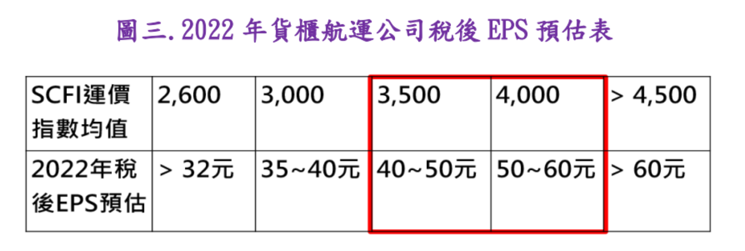 受中國限電使得運價漲多回跌很正常,但因歐美需求太強會使得運價回跌有限,貨櫃航運三雄今明兩年產業及獲利趨勢還是非常確定,預估今明兩年稅後EPS可超過40及50元以上,是目前全台股本益比最低且未來兩年殖利率最高的公司。投資人可從下圖二及三去推演出2022年獲利,但4月單月獲利是以3月運價最低點2600算起,還不包含下半年起增加的船隻及未來塞港解除的周轉率增加的運量。