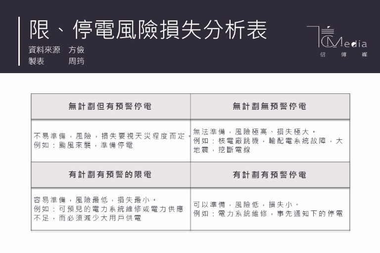 限電並不是停電,大家一定要分清楚,限電不會停電,只是針對工業大用電戶予以用電限制,在尖峰用電的時刻(一般為半小時左右),予以減少5%的用電,「限、停電風險損失分析表」可以看出限電幾乎都不會對用戶造成損害,而且大用戶有「需量競價措施」的措施,減少原有的用電,還會在電費上優惠,最高省一度電可以獲得10元的補贘,可以說塞翁失馬焉知非福,更何況大電力用戶早已安裝智慧電表系統,可以按計劃需求輕易在尖峰的短暫數十分鐘減少5-10%的用電,或是啟用備用電源因應。