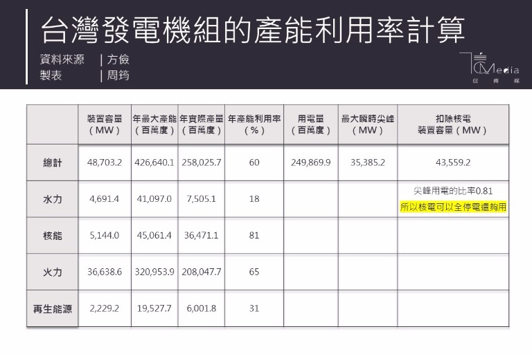 台電擅長用「專業」來唬人,我們一般產業設備都有「產能利用率」,作為產業生產線的效率指標,但是台電巧立名目,用一堆「XX容量」、「XX因素」的名詞混淆視聽。其實台電的發電機組就只電單一產品,電又沒有庫存問題,其實用產能利用率就能說明一切了。
