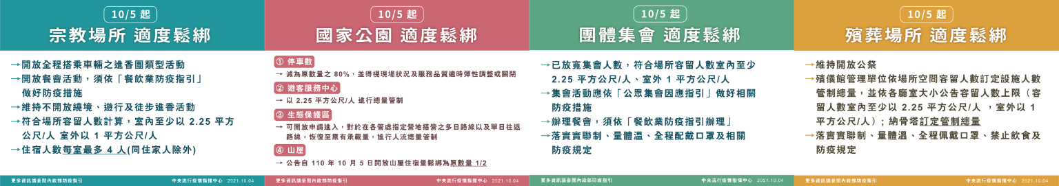中央流行疫情指揮中心今(4)日宣布,自10月5日起,鬆綁部分防疫措施,內政部表示,將適度調整宗教場所及宗教集會活動防疫管制,開放全程搭乘車輛的進香團及餐會型活動,但繞境、遊行、徒步進香活動等仍不開放;另外國家公園部分,單日往返登山承載量恢復正常,山屋住宿量由原數量1/3調整至1/2。