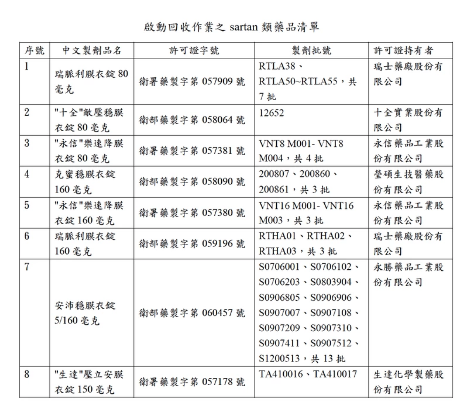 食藥署聲稱主動抽驗各來源之原料藥共78批,經確認相關受影響製劑共36批、6家許可證持有商,使用相關原料藥並受影響的製劑共有8項產品,針對檢驗結果高於限量規範者,已暫停輸入其原料藥來源,且須於11月4日前完成回收。