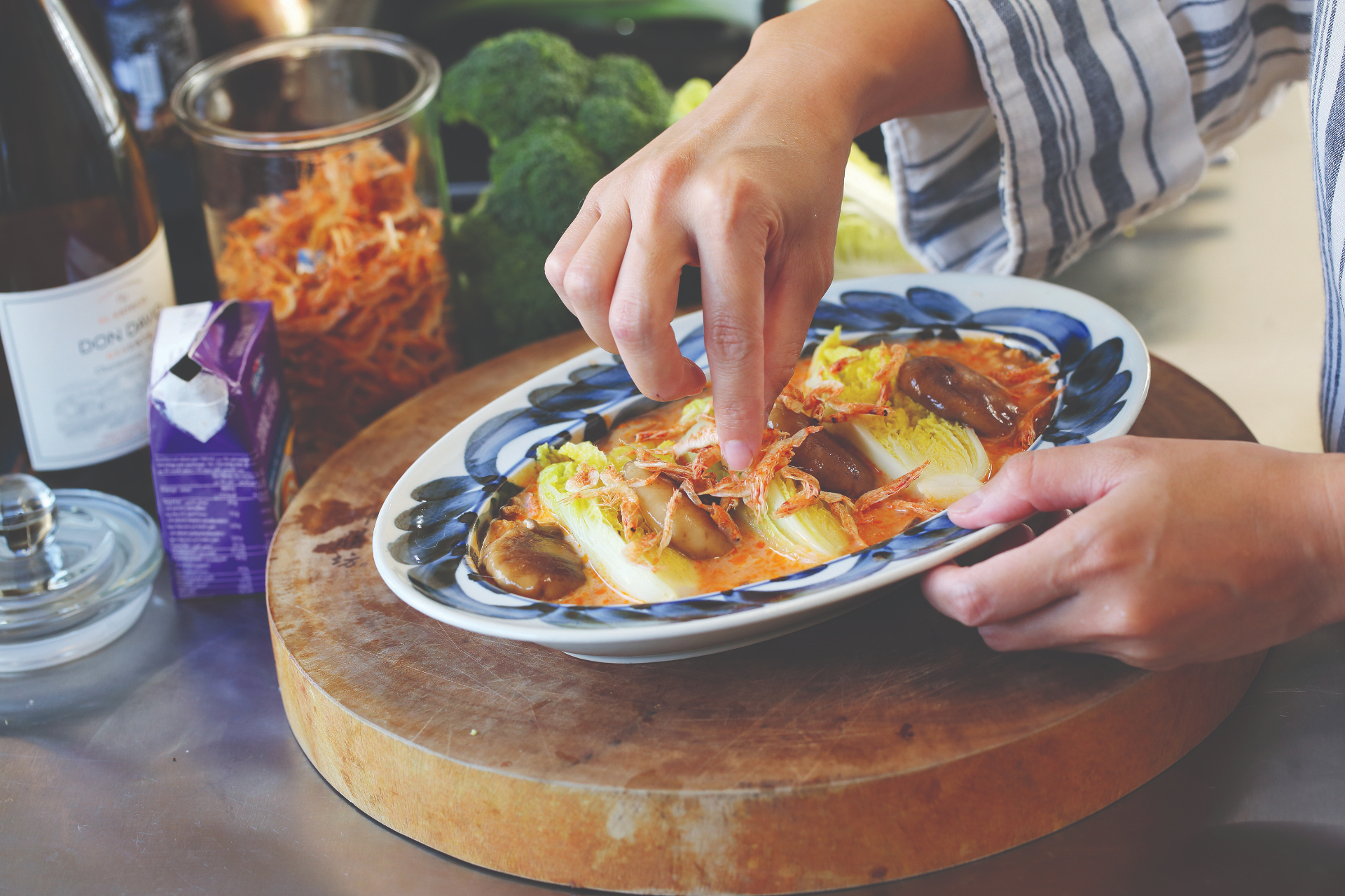6 鋪上娃娃菜、香菇、櫻花蝦、起司絲。