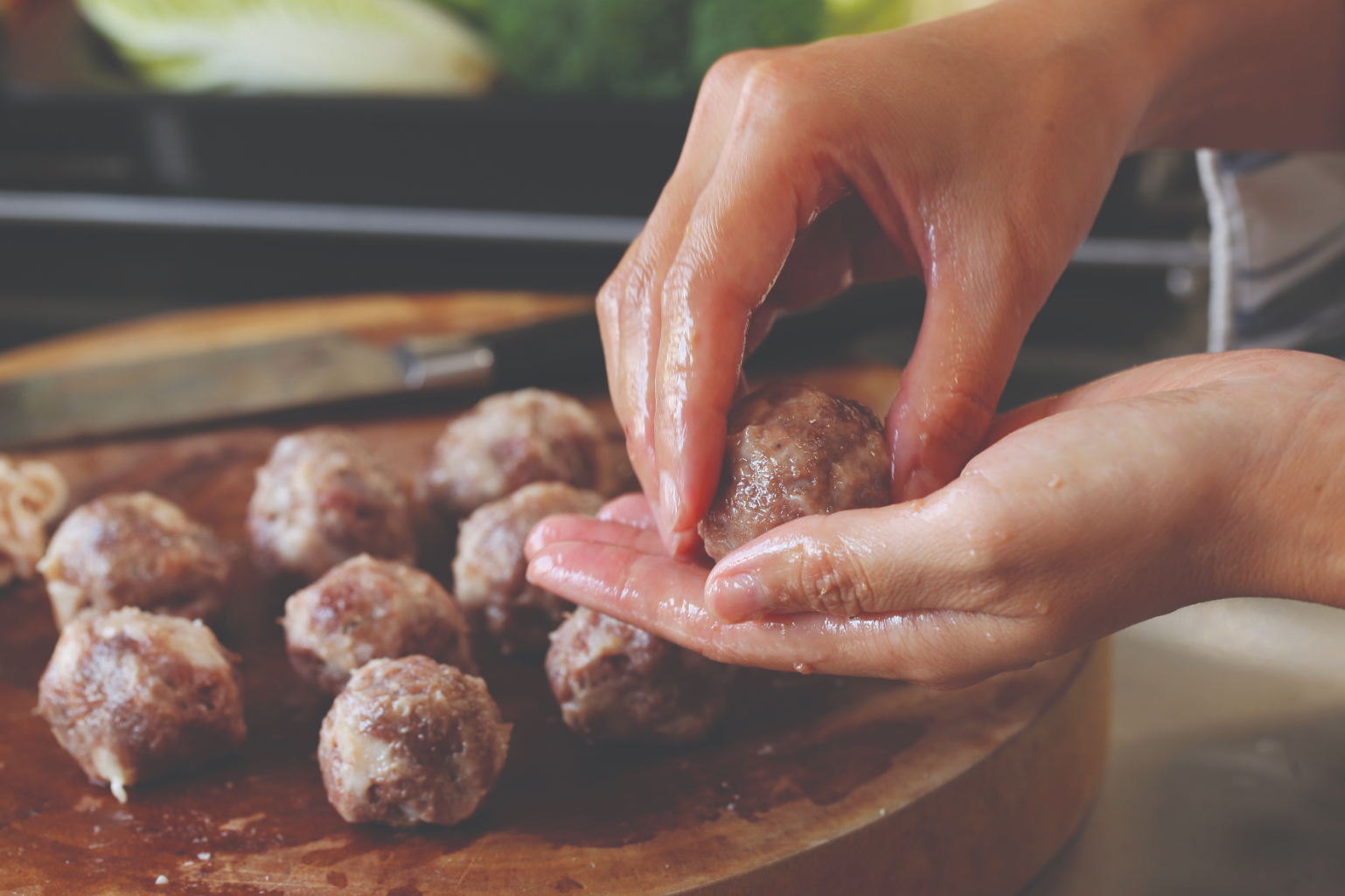 1 將風味漢堡排外層的豬油網剝除,將三個漢堡排肉搓成適當大小之丸子。