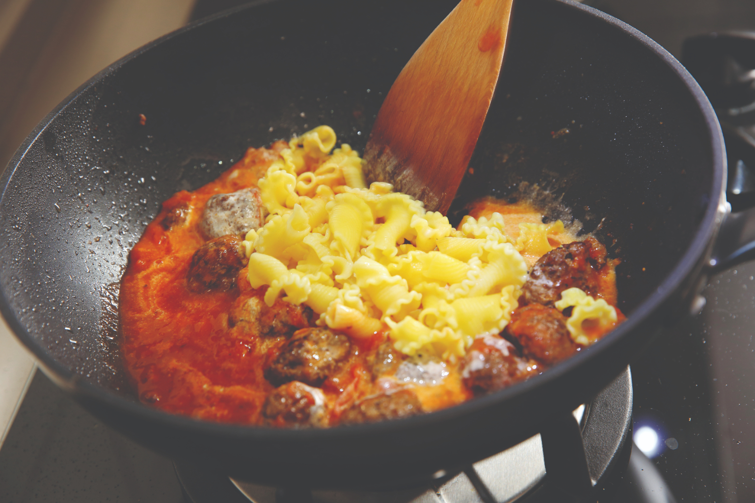 4 加入義大麵與一杯半鮮奶油。稍微收乾醬汁後,加入羅勒葉與帕瑪森起司一大匙拌勻即可起鍋。