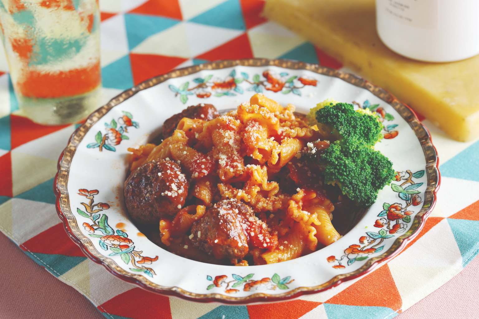 風味漢堡排一包、番茄糊三大匙、白酒適量、蔬菜(建議番茄、蘑菇、花椰菜擇一)、鮮奶油一杯半、海鹽適量、胡椒適量、羅勒葉少許、帕瑪森起司適量