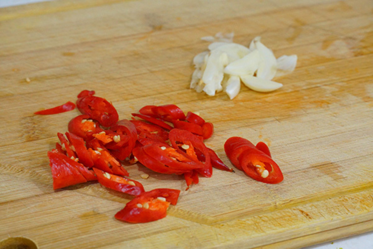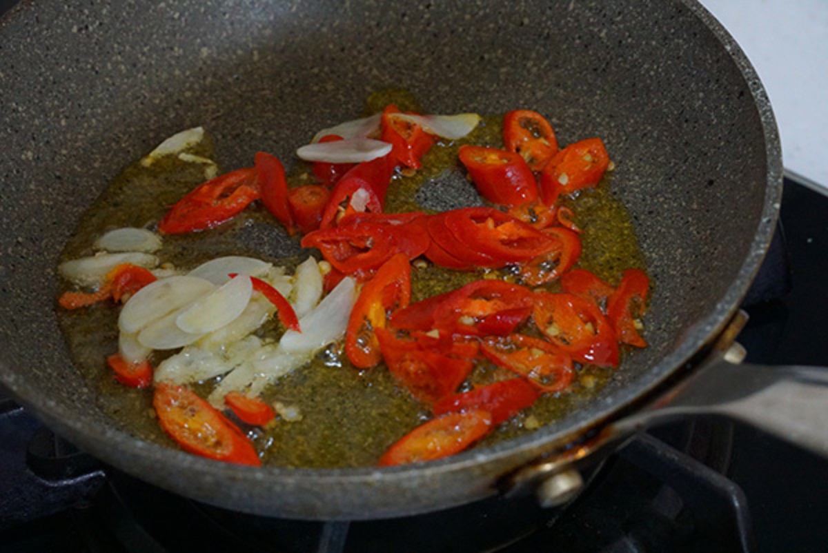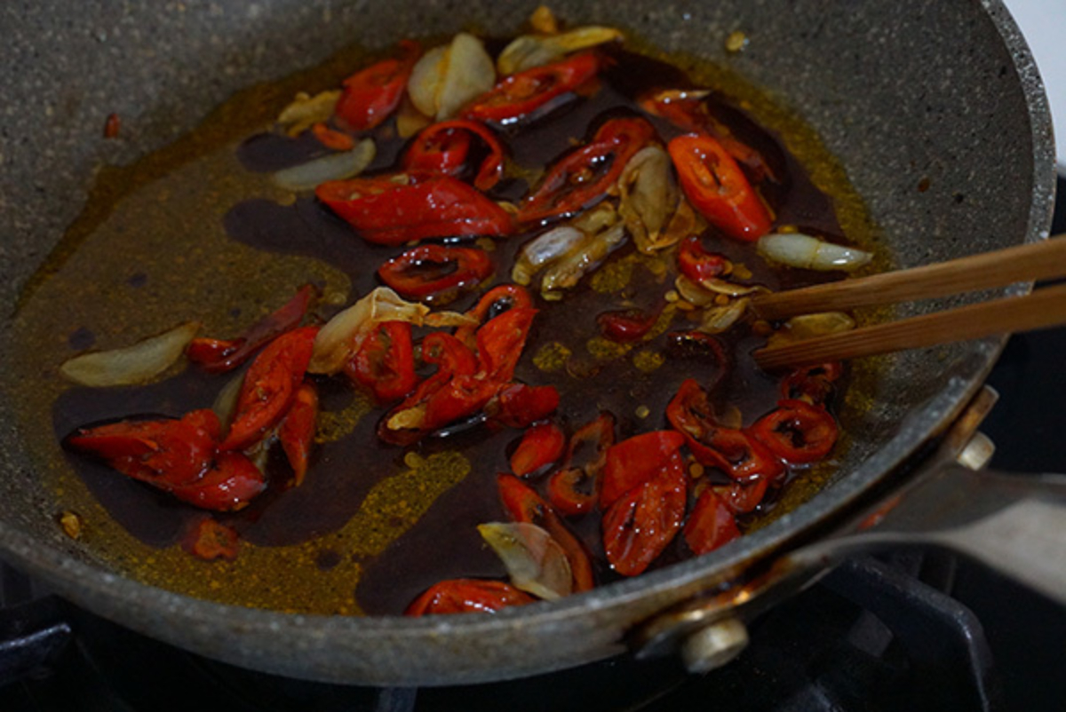 平底鍋加入沙拉油熱鍋,辣椒與蒜片爆香後再加入香油1大匙一起爆香。