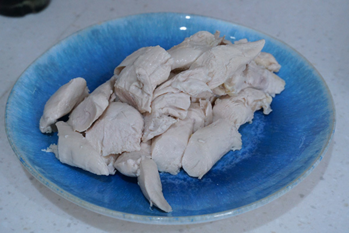 滾水加入鹽巴製成鹹水,川燙雞肉後切塊。
