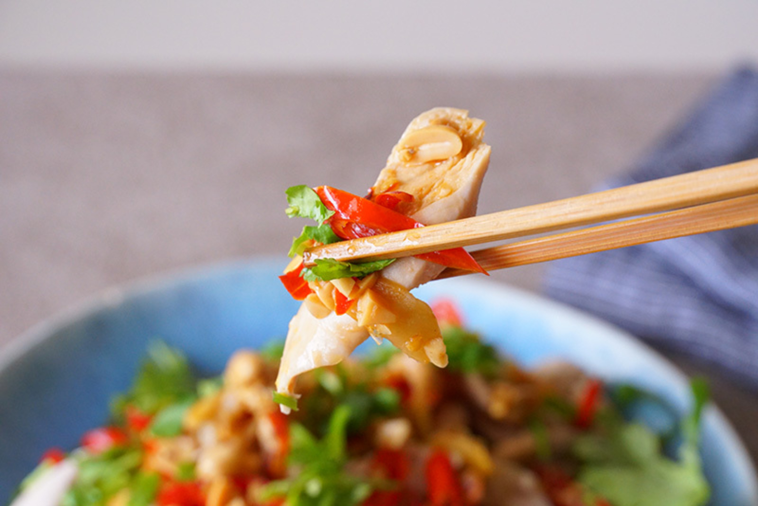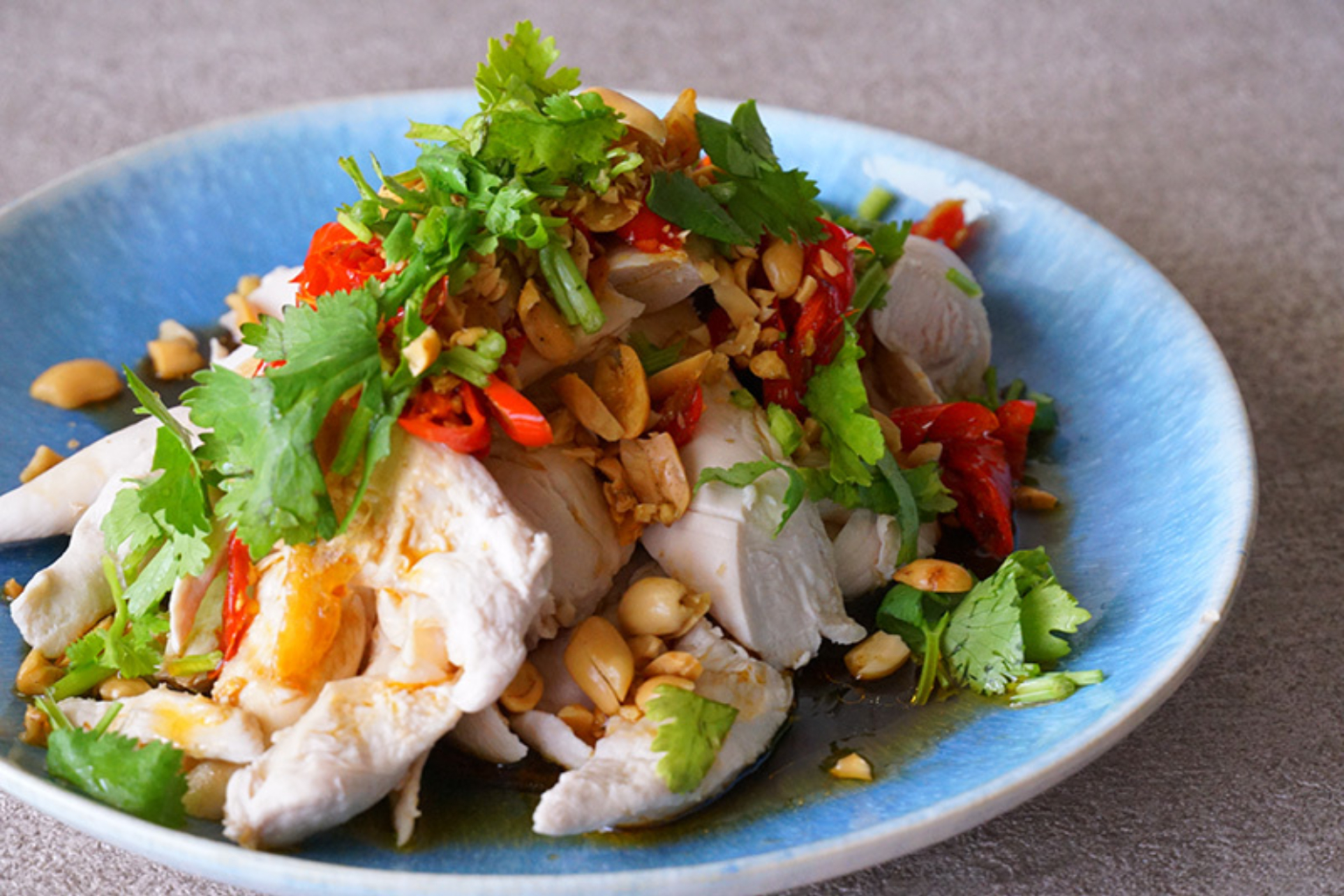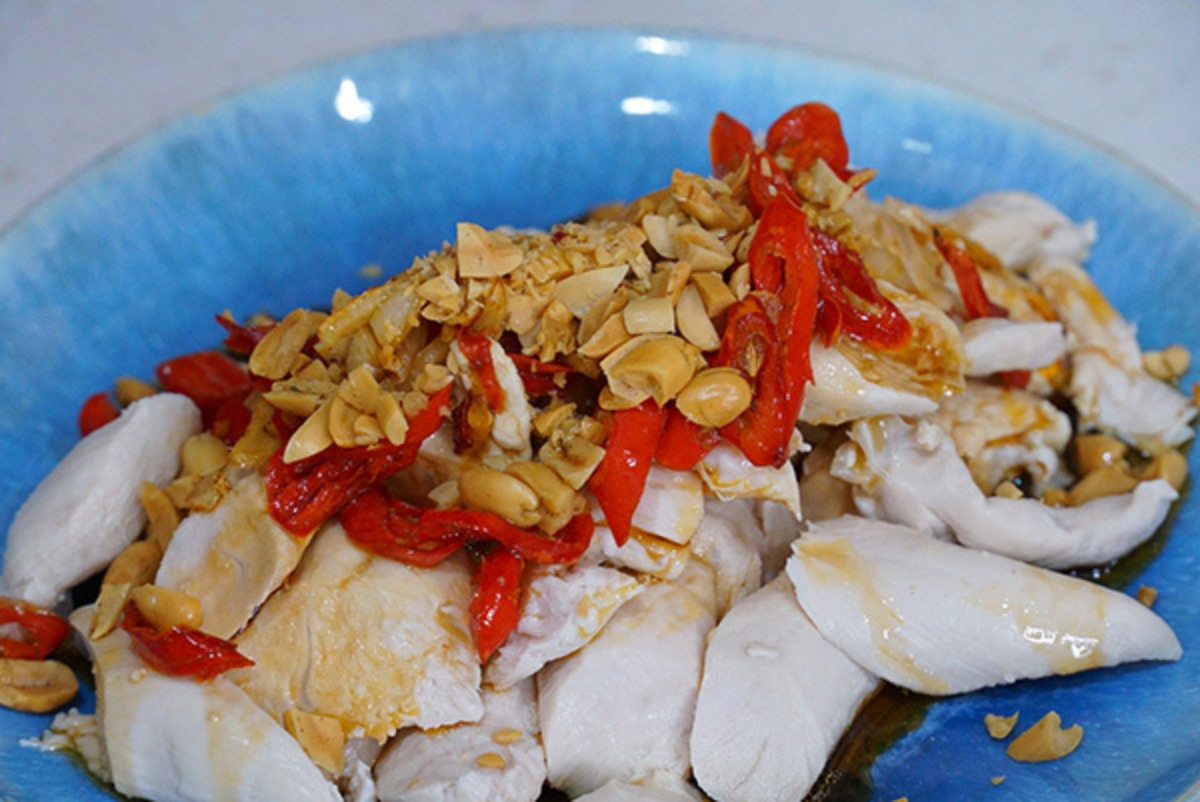 雞肉淋上醬汁,切碎花生鋪上,擺上香菜就完成啦。