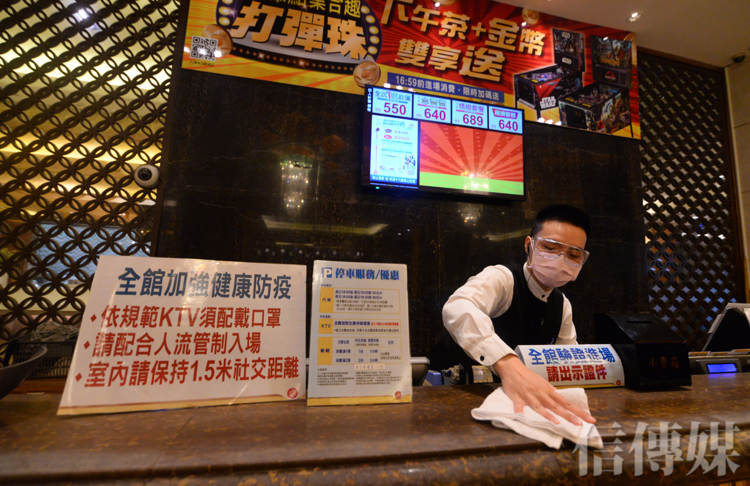 根據防疫規定,KTV服務人員需要掛上已快篩證明名牌。(攝影/趙世勳)
