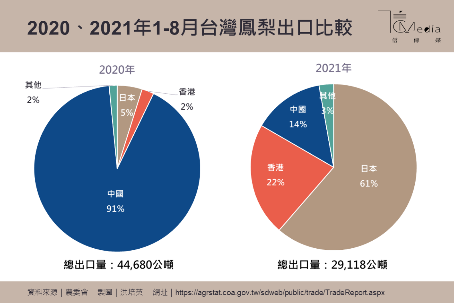 而中國2月以檢疫為由禁止進口台灣鳳梨後,儘管台灣1-8月鳳梨外銷量與去年同比下降35%,但也成功進軍日本、香港市場,對日出口和去年同期相比增加8倍、香港則是6倍。外媒評台灣在「鳳梨大戰」獲勝,同樣遭中國封殺的釋迦、蓮霧有望循此找到出路。