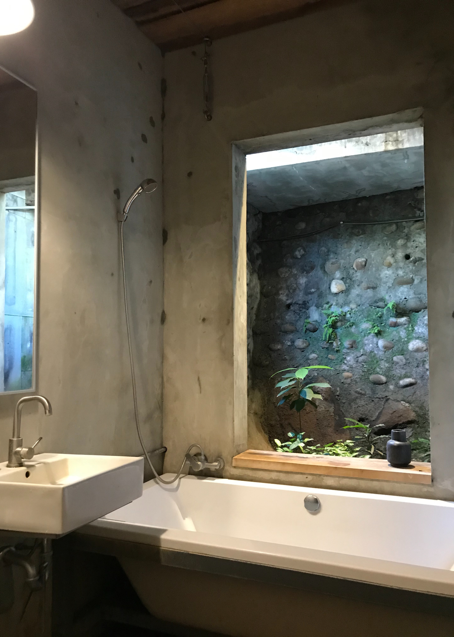 藉著打掉部分的牆壁,利用內外牆的空間做了一個小花園,拉兩條鋼索放置未來也許會用到的老檜木當天花板,搭配這個空間所能置入的最大浴缸,實現了擁有半露天風呂的多年願望。