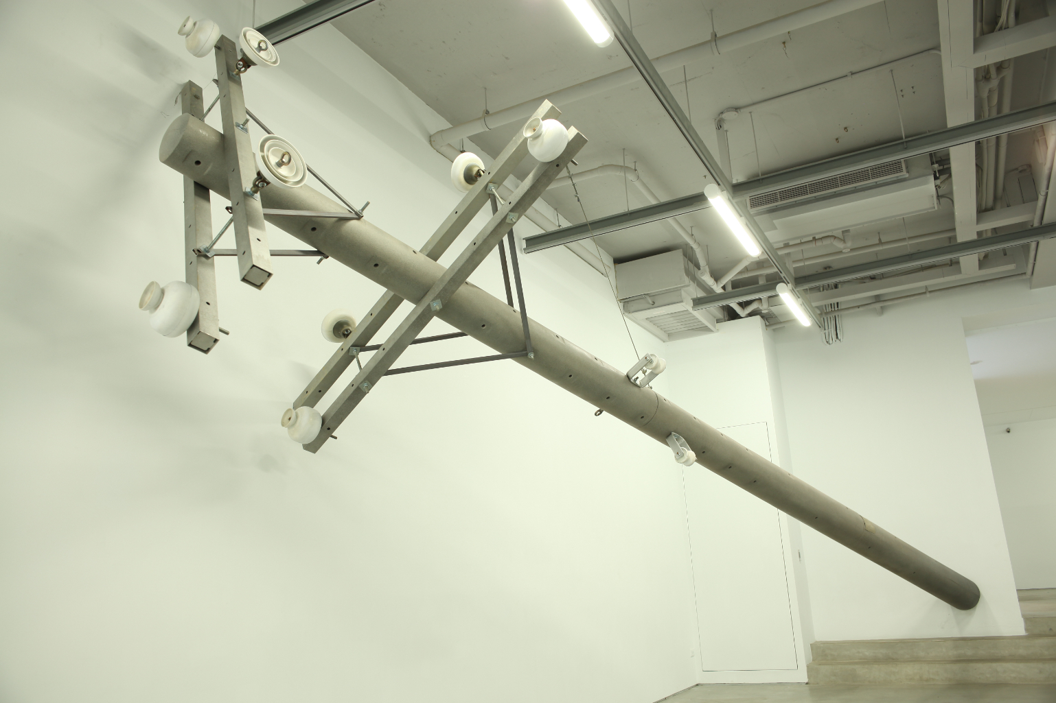 一支傾倒的電線桿,橫躺在展場的牆壁上,並未完全著地,對重量的直覺,讓觀者產生一些顧慮,夾雜在信與不信之間。