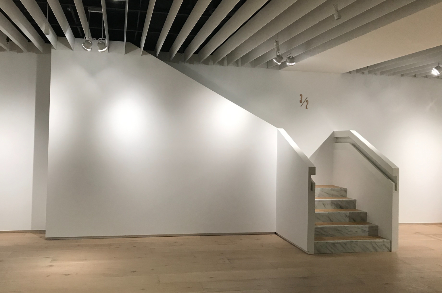 以美術館的室內空間建築設計元素,仿造一個樓梯,置於展場中央,看似可以到達另一個樓層空間,卻在行進過程中遇到阻礙,哪裡都去不了。