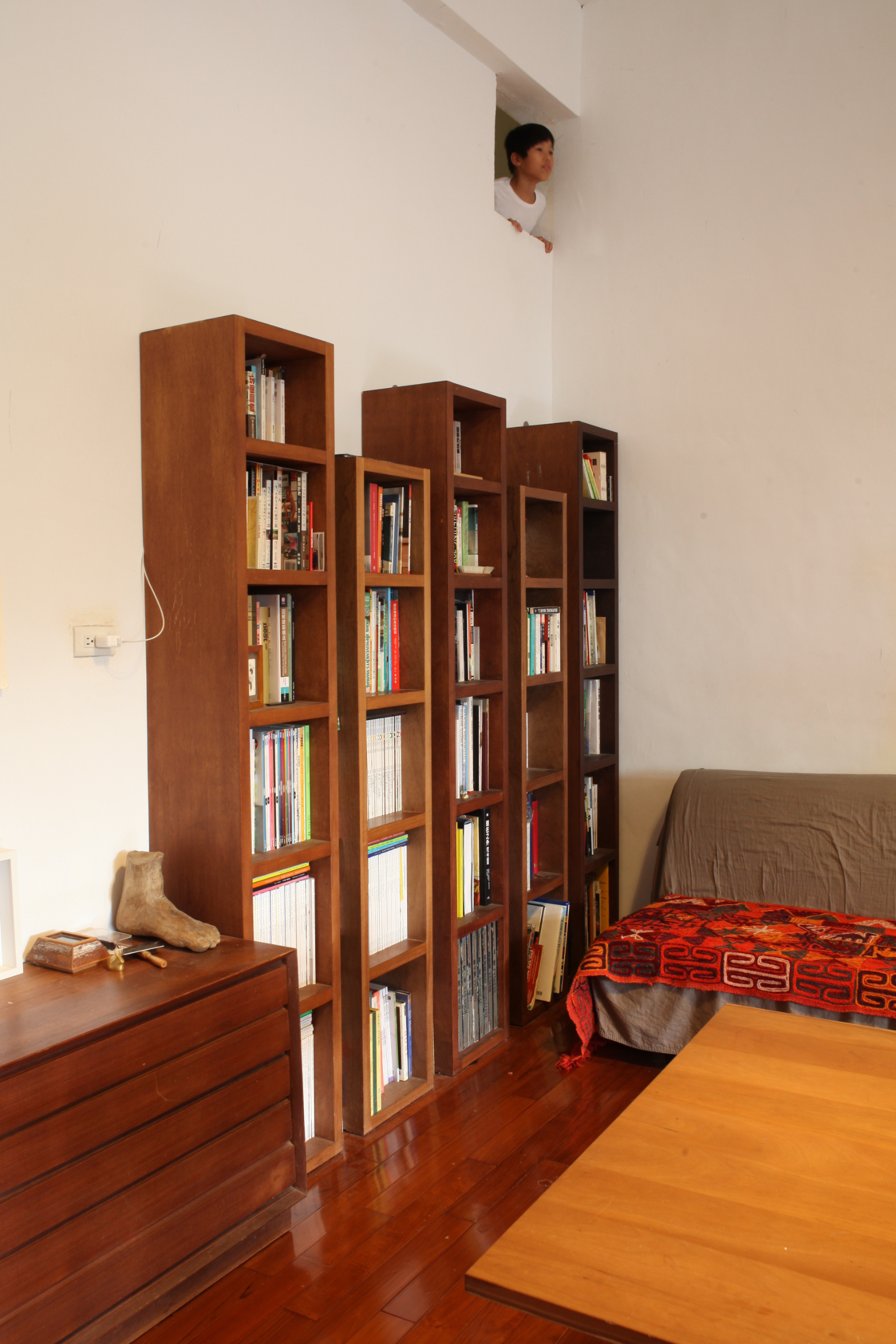 小孩出生後,利用簡單的夾層設置,增加了育兒房,隨著小孩的成長,遊戲間、圖書間、兒童臥房也就陸陸續續地出現了。最滿意的是,這個空間處於活著的狀態,會不斷變化、增生。