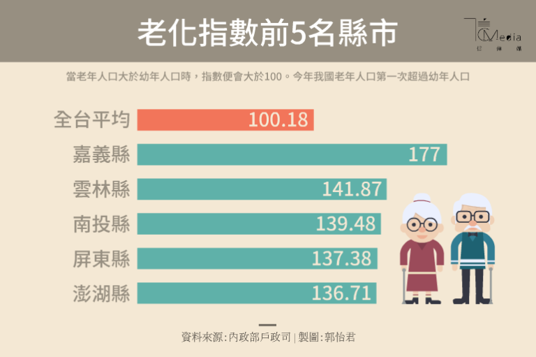 一般會認為離島的年輕人口外移情況較為嚴重,相對的離島縣市的人口老化程度應該就會更加明顯,但根據內政部戶政司的統計數據顯示,嘉義縣自2011年起就一直蟬聯台灣老化指數最高的縣市。而嘉義縣今年的老化指數更增加至177,等同於在嘉義縣每100個14歲以下幼年,就有177個65歲以上老人,老化情況相當嚴重。